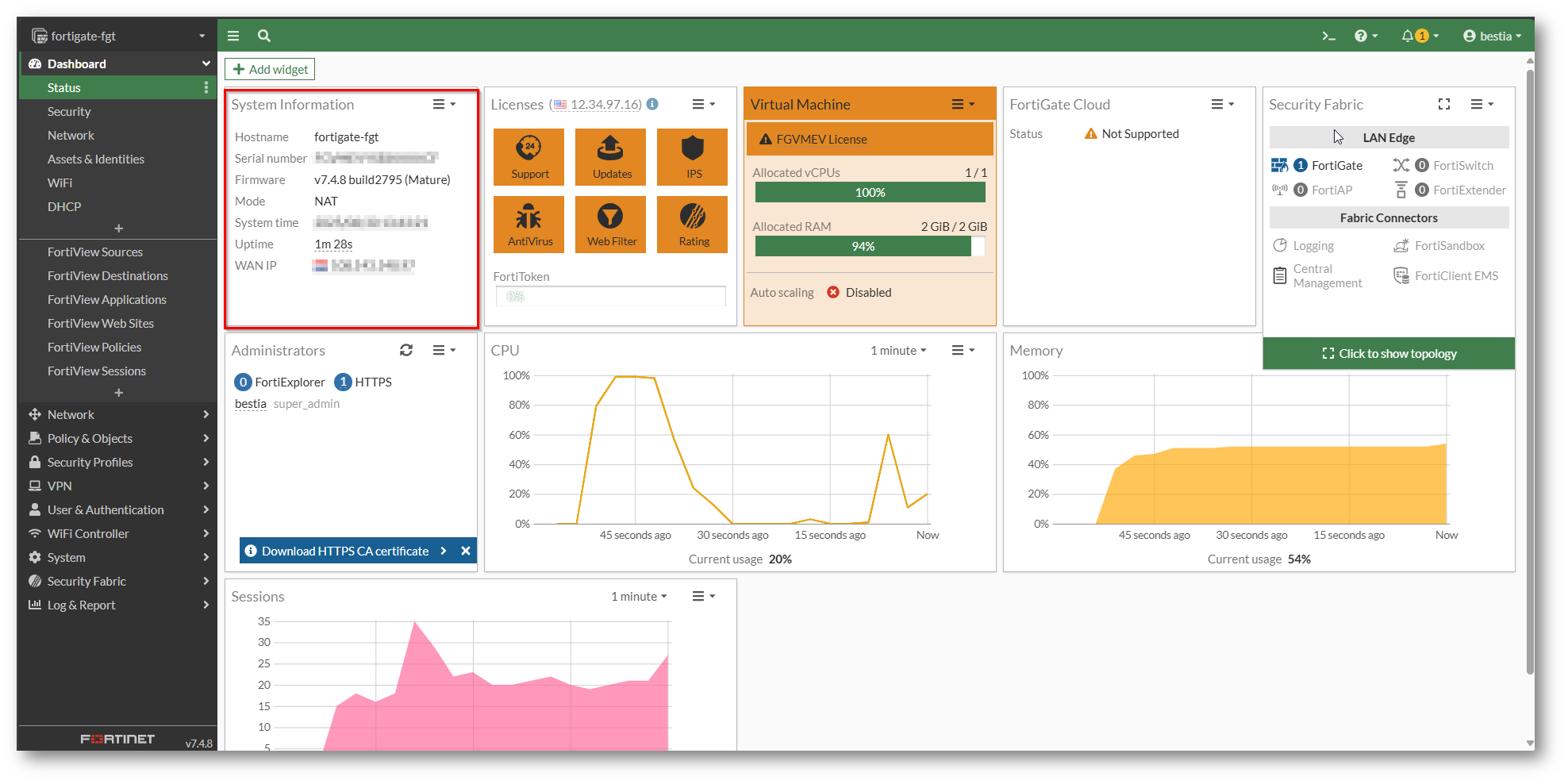 Ora vi mostrerò come poter eseguire il download dei log di navigazione dal Firewall FortiGate ed eseguire l’Upload Manuale all’interno della cloud discovery, loggatevi all’interfaccia amministrativa del vostro firewall FortiGate.