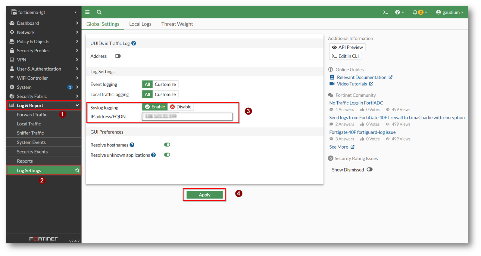 Ora accedete all’interfaccia del FortiGate per configurare l’invio dei log alla macchina Docker