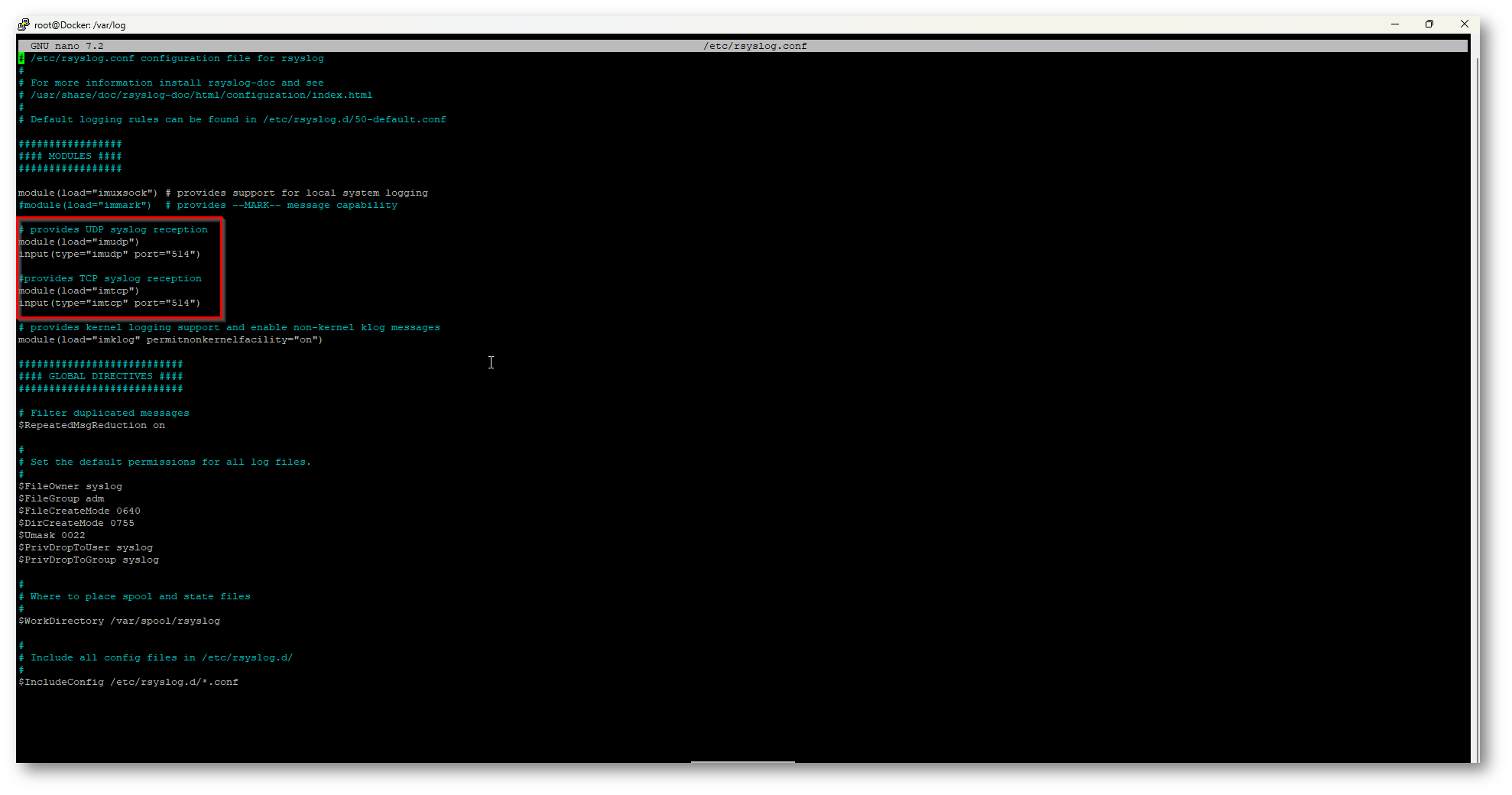 Figura 43: Rimuovere i commenti “#” da module e input per permettere la corretta ricezione dei log, successivamente premere ctrl+x e y per i salvataggio del file
