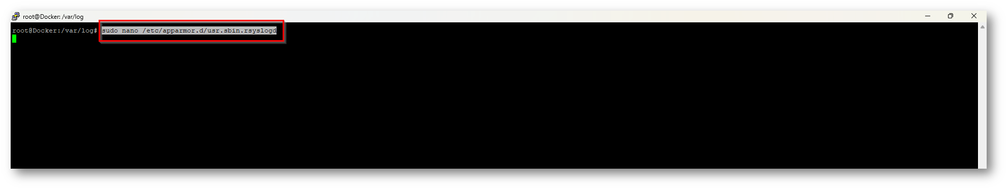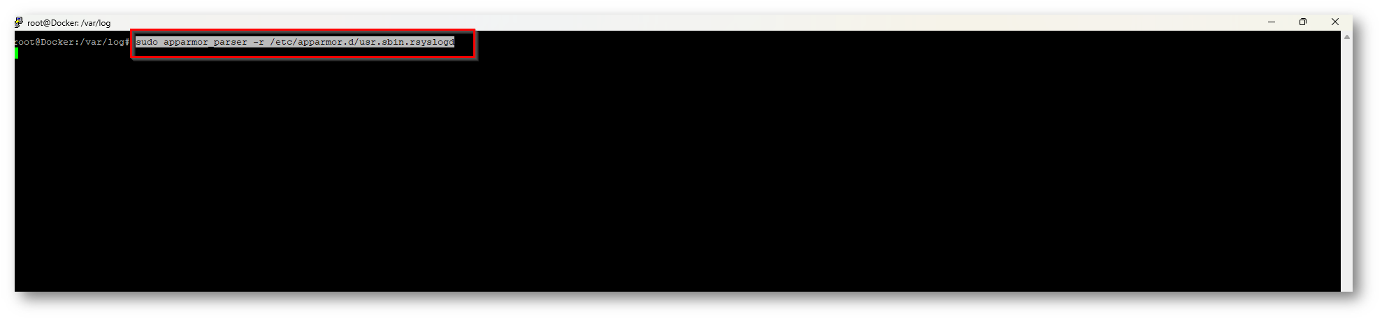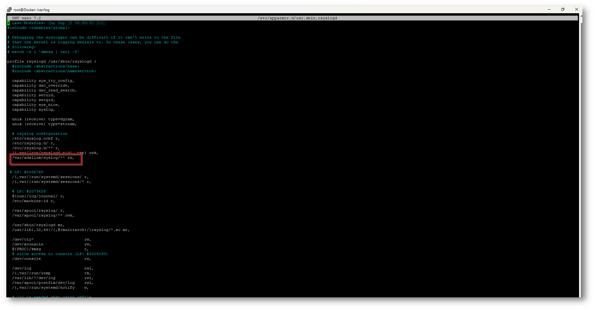 Analizzando i log di Syslog presente nella seguente cartella: “/var/log/syslog” ho notato che era presente un errore “Docker kernel: audit: type=1400 audit(1757064505.646:2607): apparmor=”DENIED” operation=”mkdir” class=”file” profile=”rsyslogd” name=”/var/adallom/syslog/514/” pid=11656 comm=72733A6D61696E20513A526567 requested_mask=”c” denied_mask=”c” fsuid=0 ouid=0″