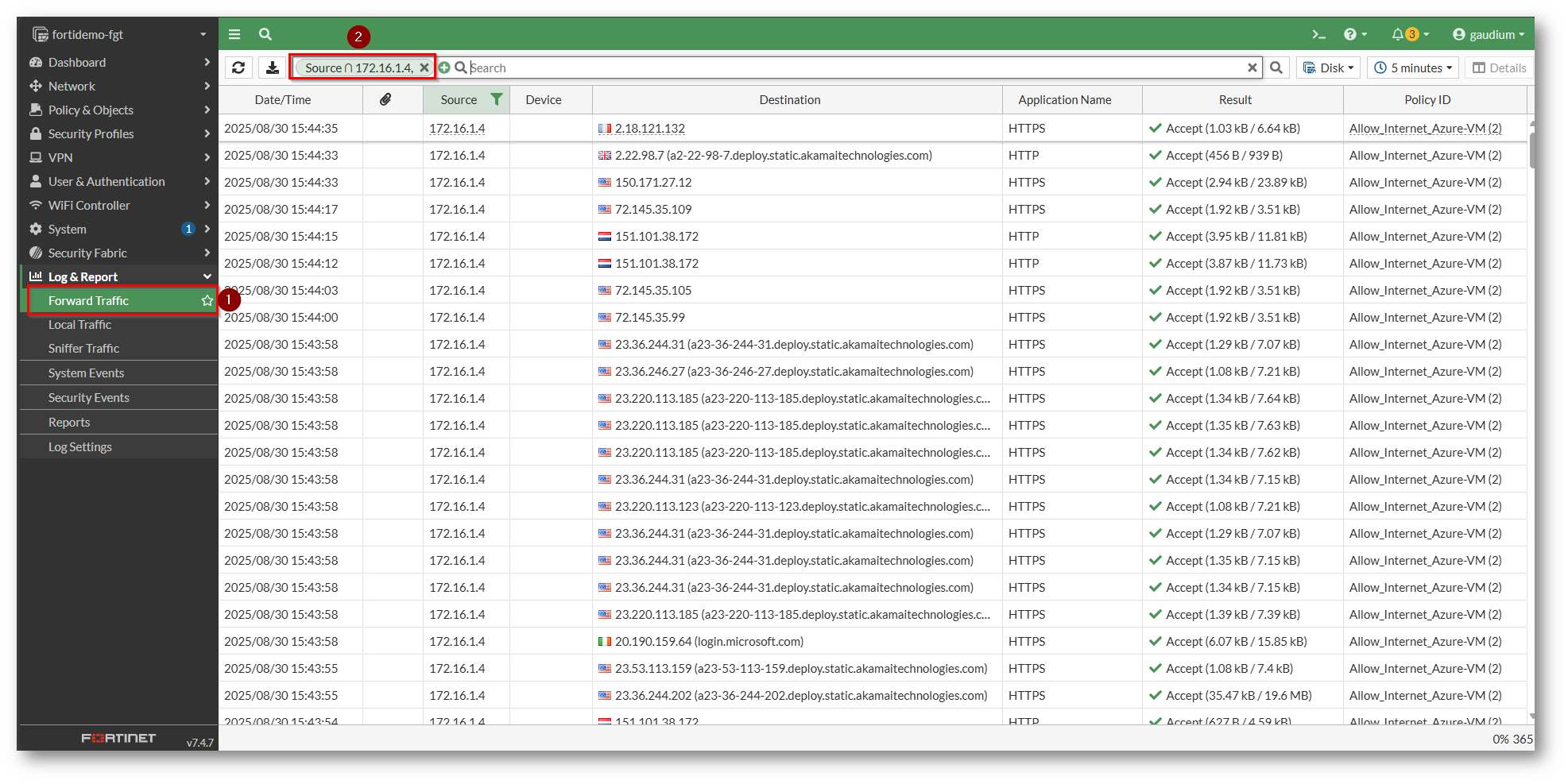 Figura 6: Forward Traffic sul firewall filtrando come sorgente l’IP privato della macchina Demo