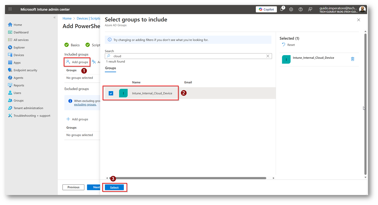Figura 22: Ora selezionato il gruppo di device a cui volete applicare lo script, nel mio caso “Intune_Internal_Cloud_Device”