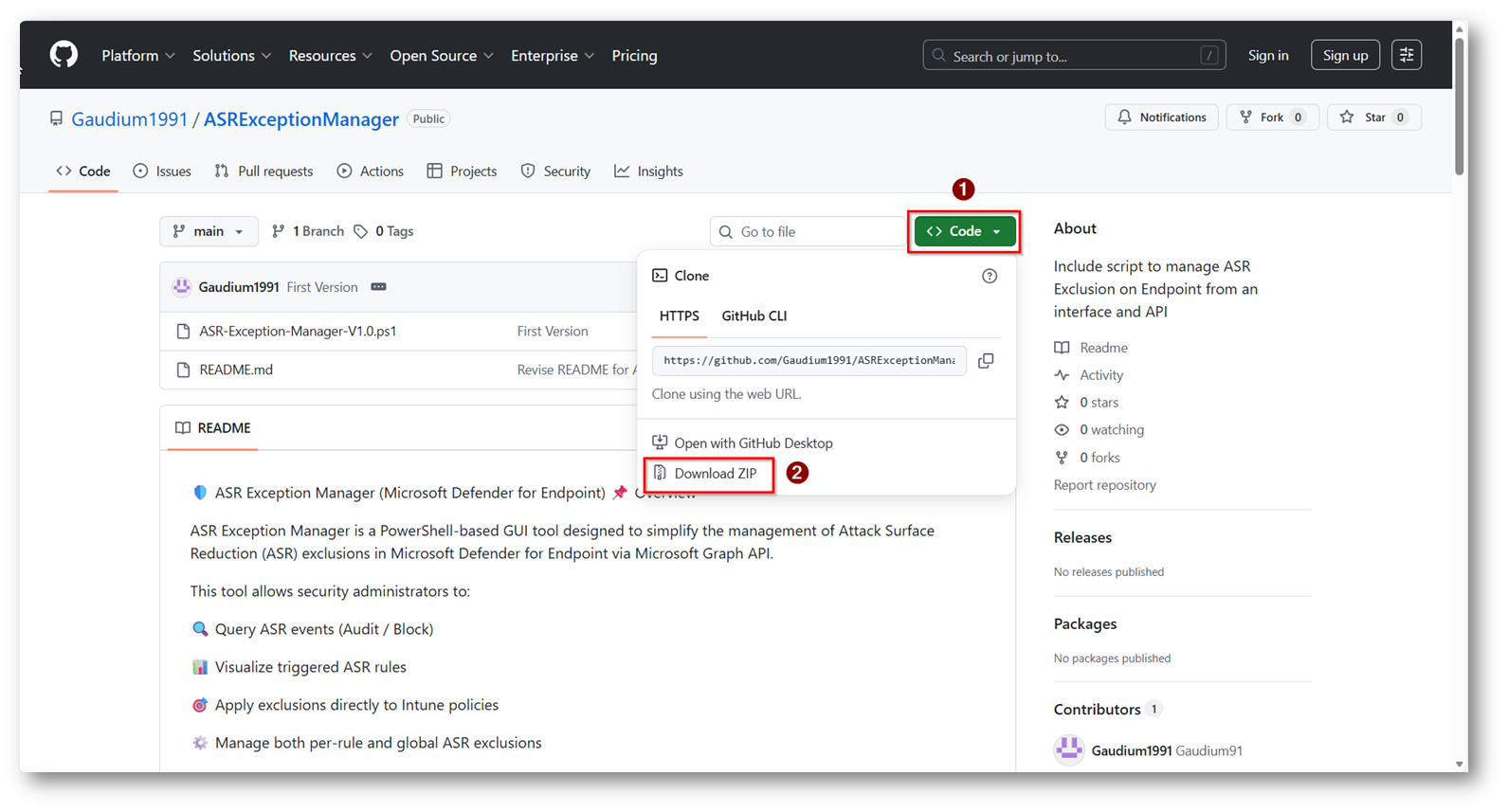 Ora dovrete scaricare lo Script PowerShell che ho messo all’interno del mio Repository di GitHub a beneficio della community Gaudium1991/ASRExceptionManager: Include script to manage ASR Exclusion on Endpoint from an interface and API