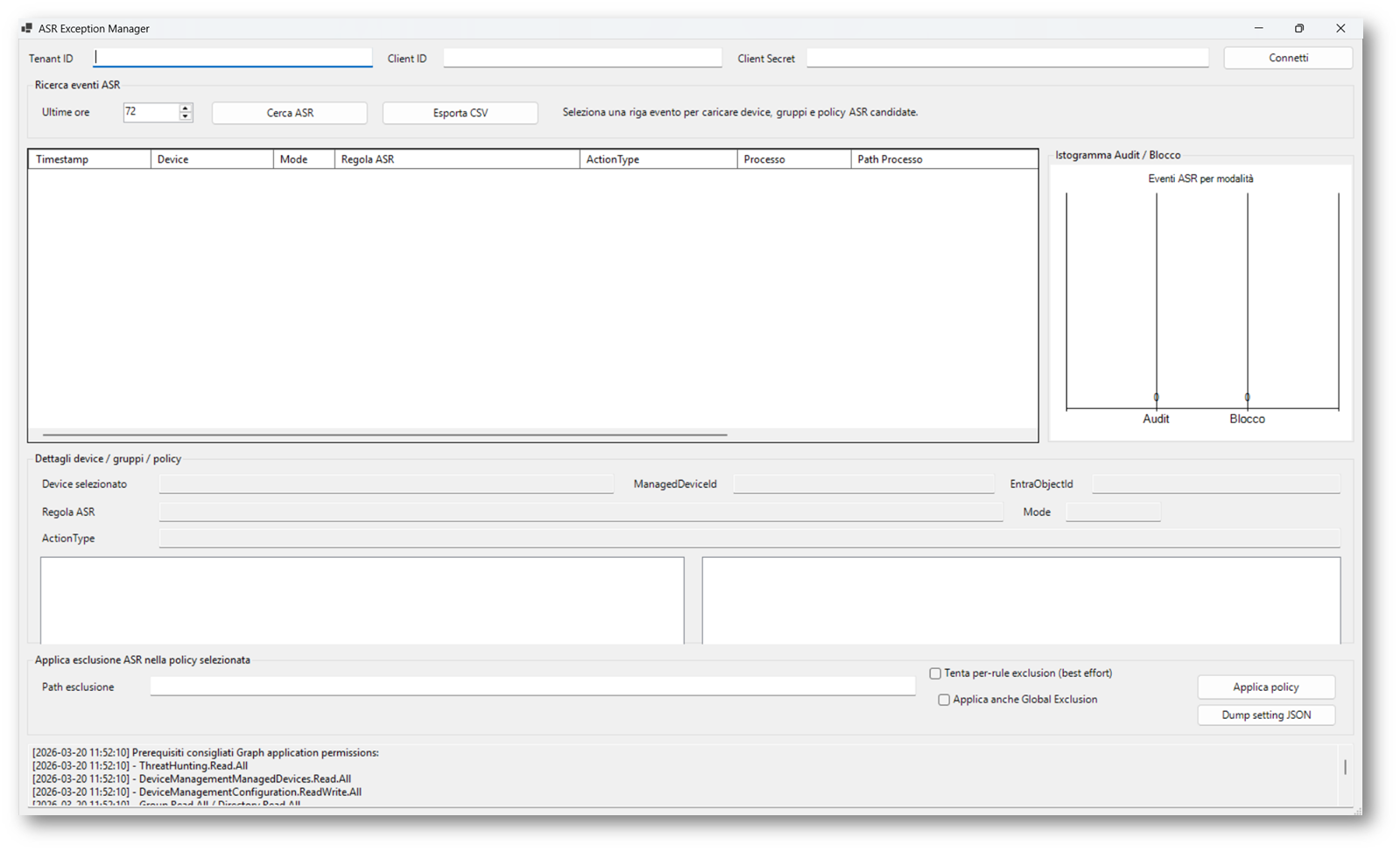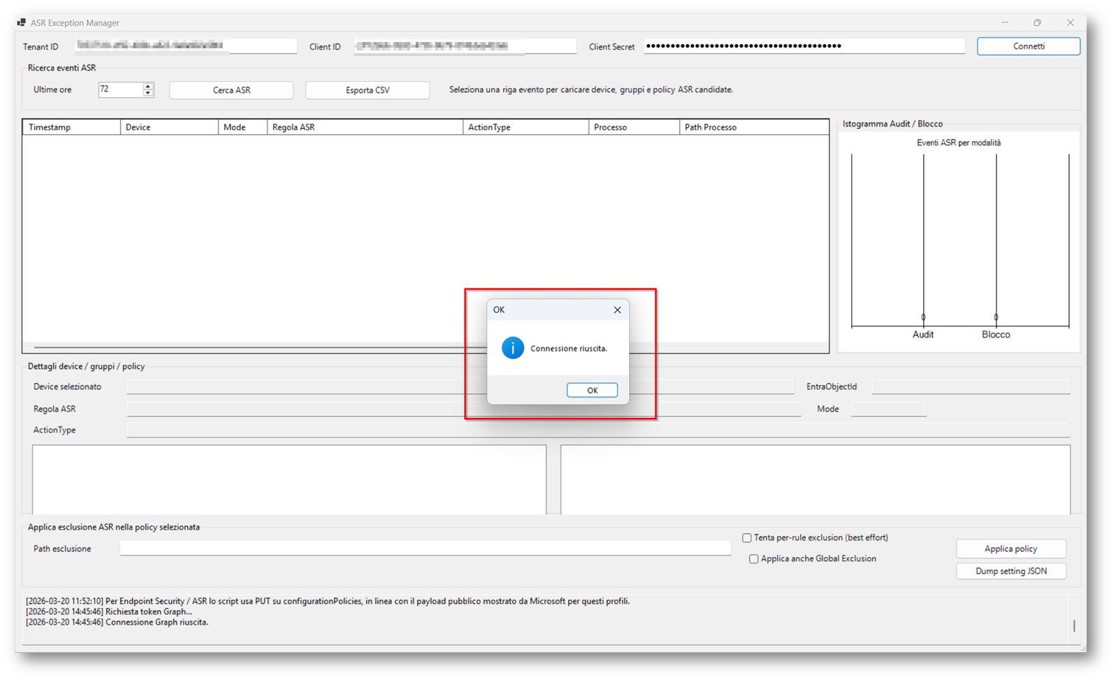 Uno script PowerShell con interfaccia grafica, che tramite API, si colleghi al Tenant Microsoft 365 verifichi quali ASR risulta in modalità blocco e permetta di inserire direttamente le esclusioni nella rispettiva regola senza dover accedere ogni volta al tenant.