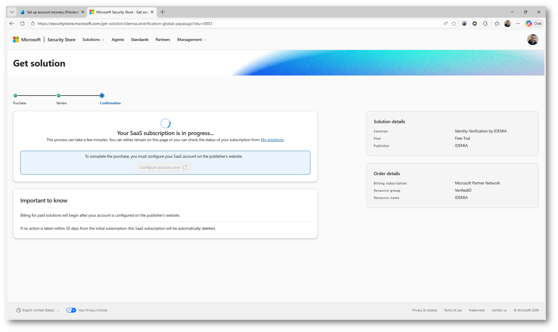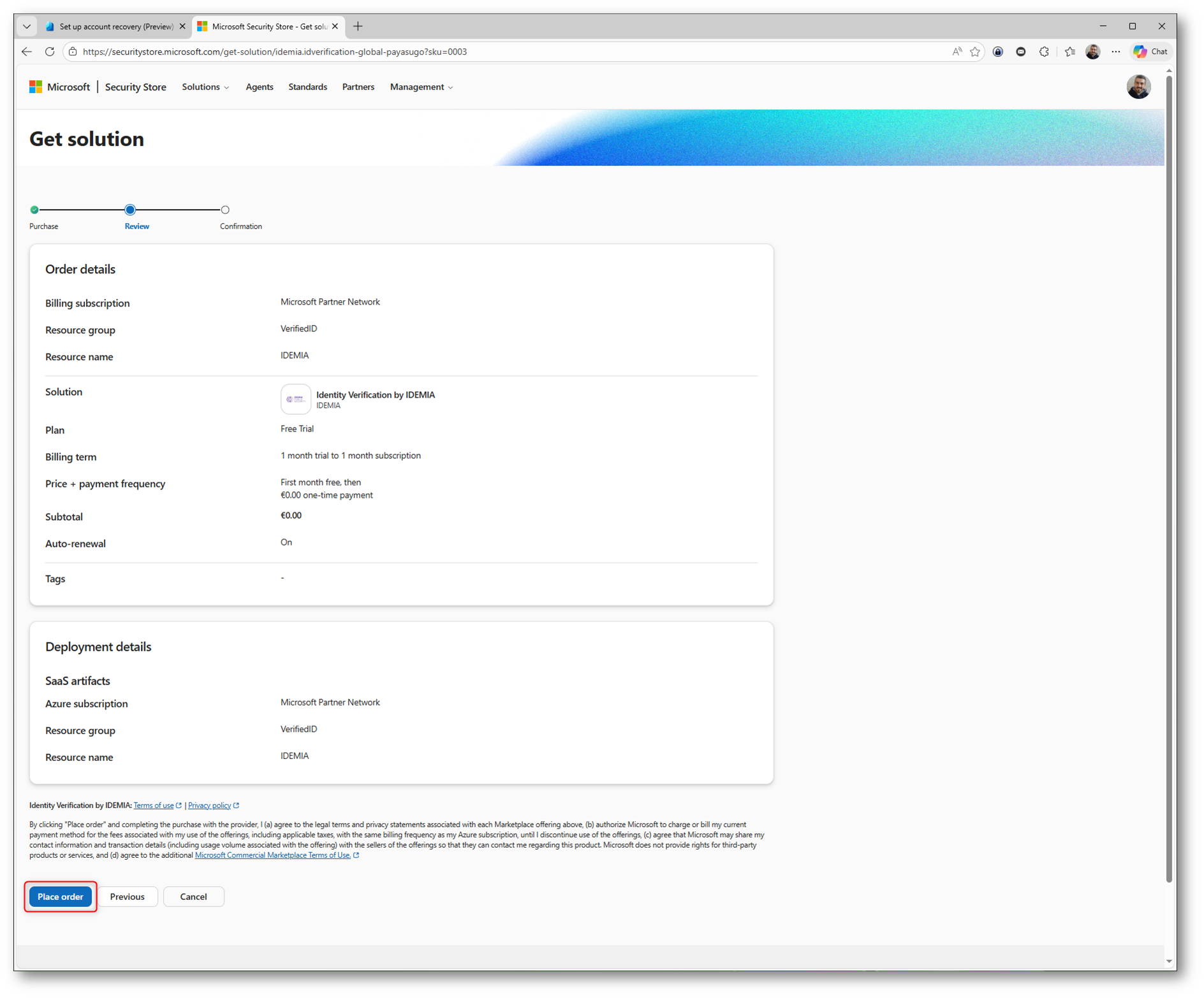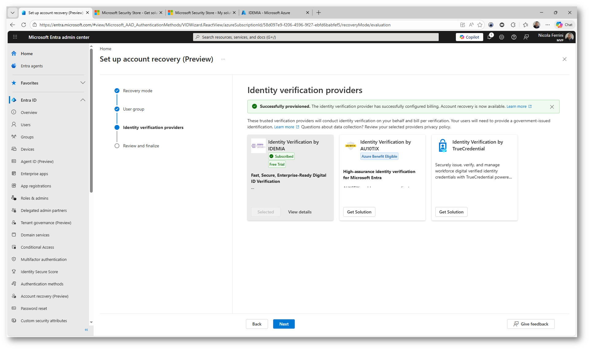 Per completare l’operazione dovete cliccare su Place order, che avvia il provisioning del servizio e l’integrazione con Microsoft Entra ID. Da questo momento il provider IDEMIA sarà disponibile per essere utilizzato nel flusso di Account Recovery.