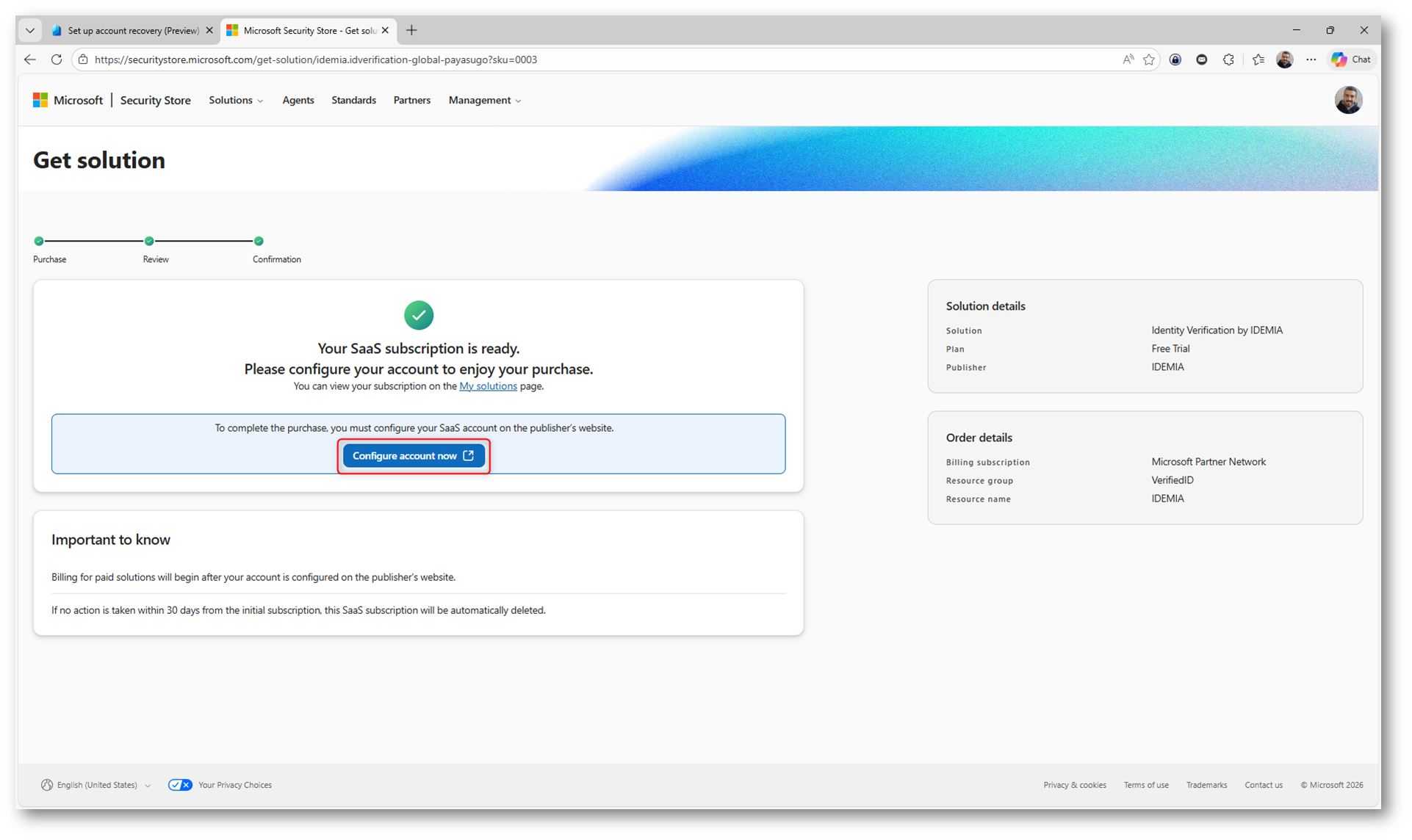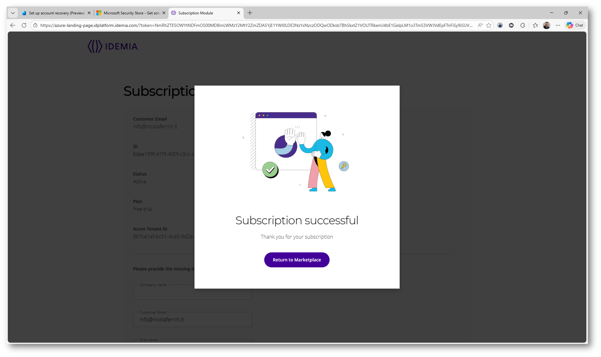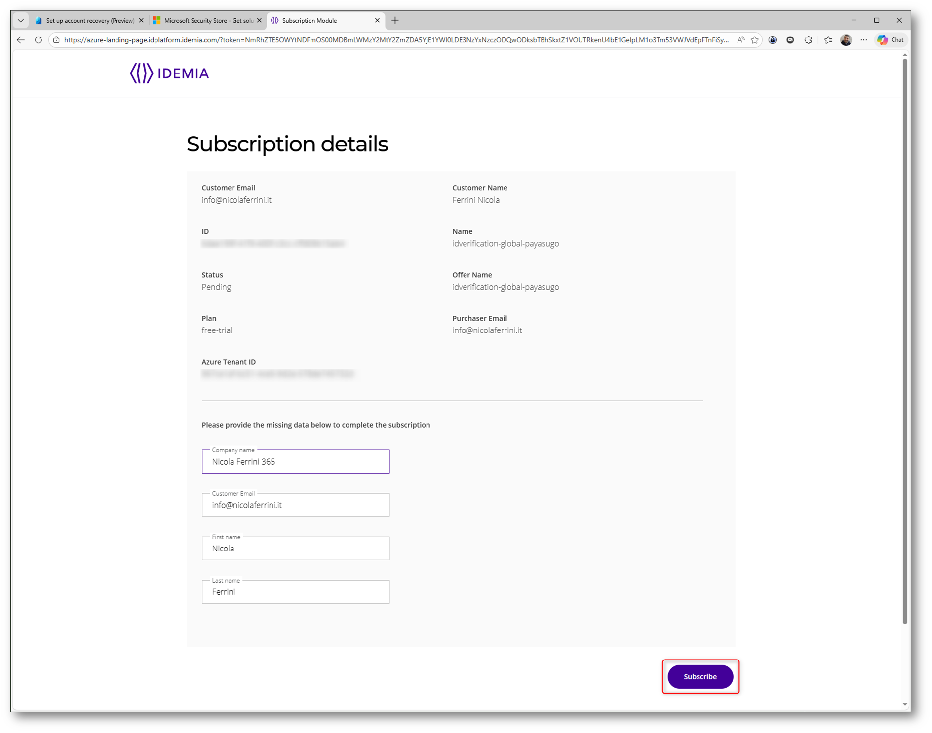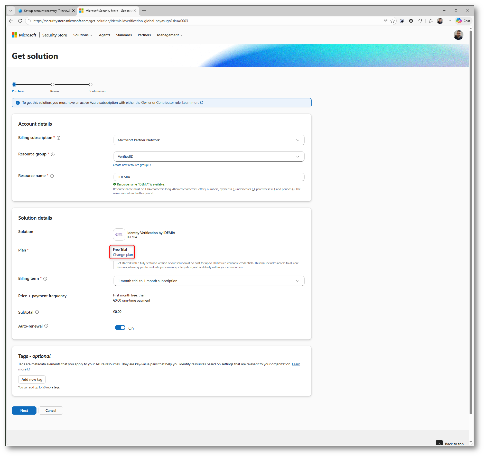 Figura 7: Configurazione della sottoscrizione Azure e attivazione del Free Trial per il provider IDEMIA nel Microsoft Security Store