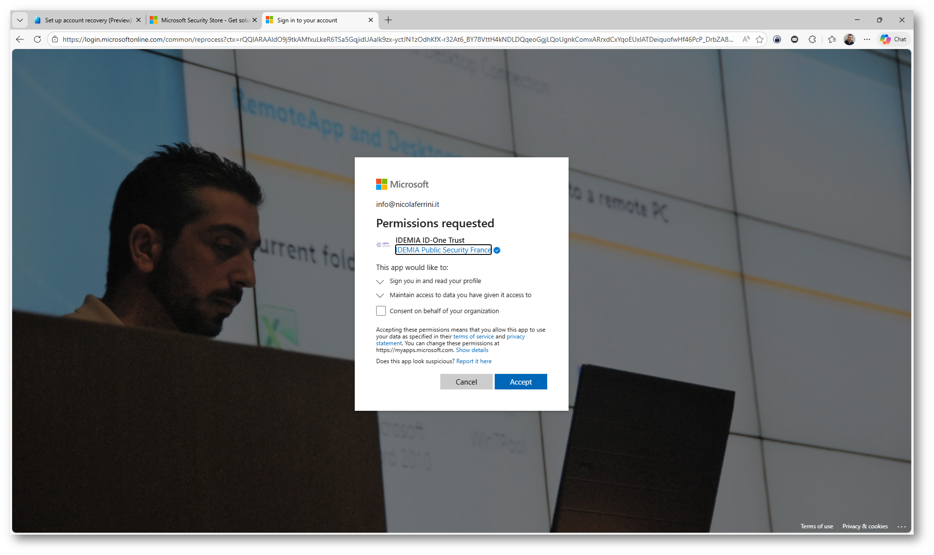 Durante la configurazione finale viene richiesto di concedere le autorizzazioni all’applicazione del provider IDEMIA. In questa fase state autorizzando l’integrazione tra il servizio di Identity Verification e il vostro tenant di Microsoft Entra ID.