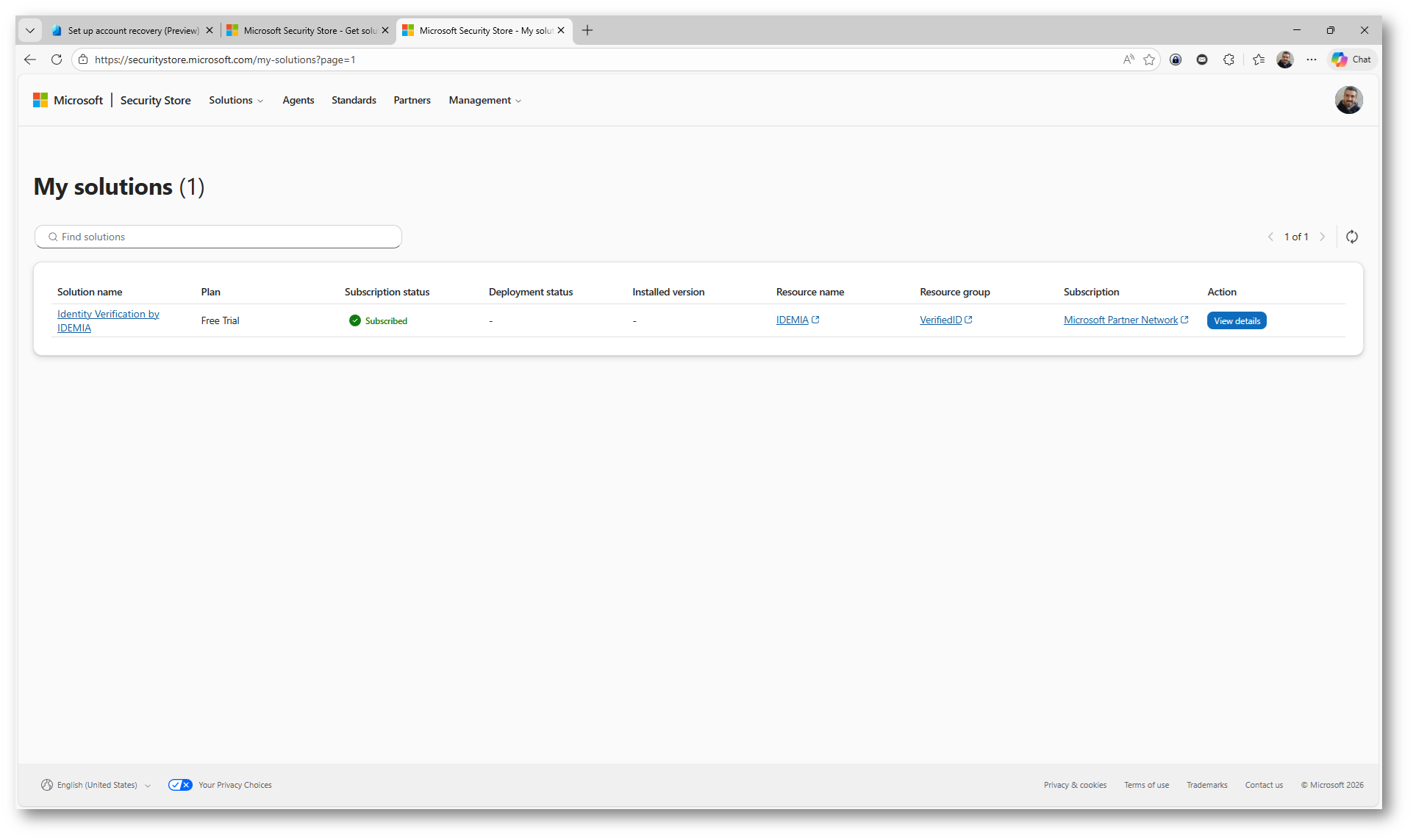Figura 15: Verifica dello stato “Subscribed” del provider IDEMIA nella sezione My solutions del Microsoft Security Store