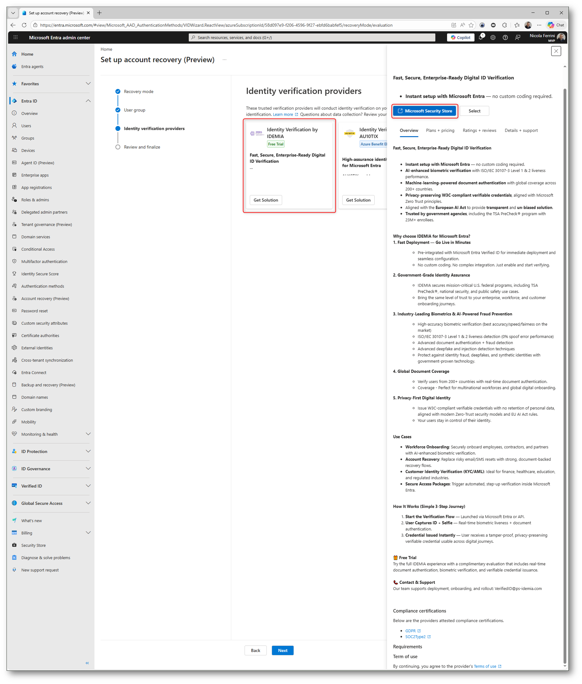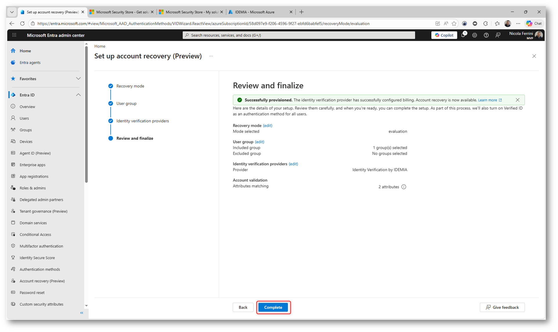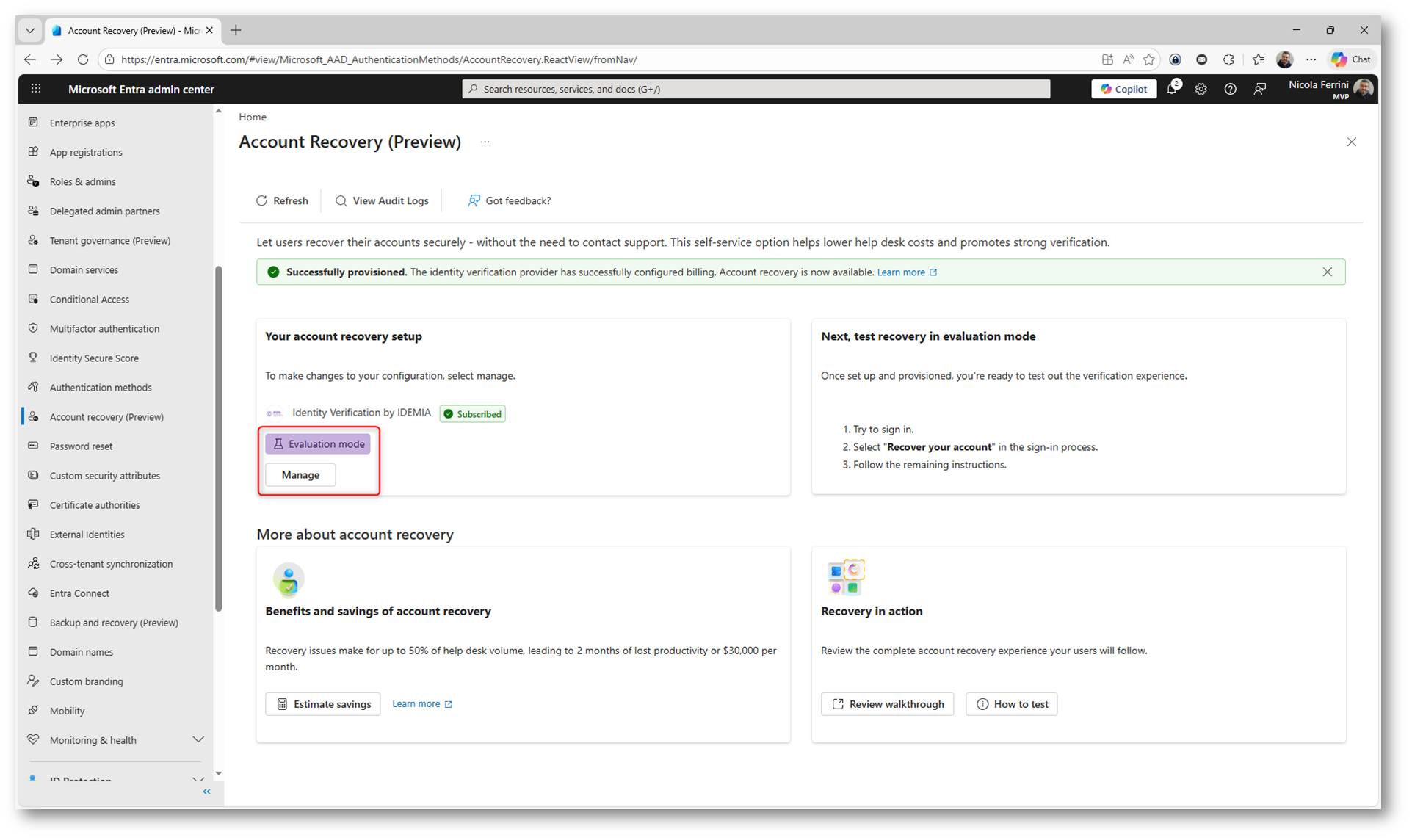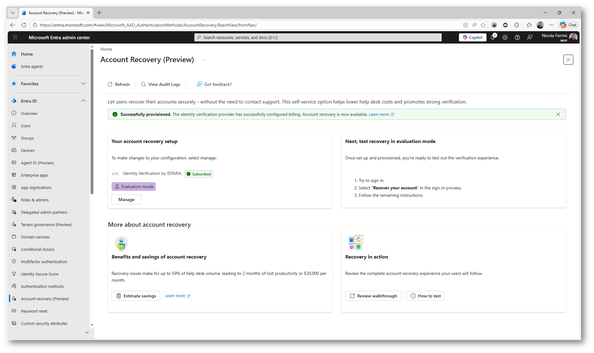Una volta completato il wizard, la funzionalità di Account Recovery risulta attiva nel portale di Microsoft Entra ID. Potete verificare subito lo stato della configurazione: il provider IDEMIA è Subscribed e la modalità è impostata su Evaluation, pronta per essere testata.