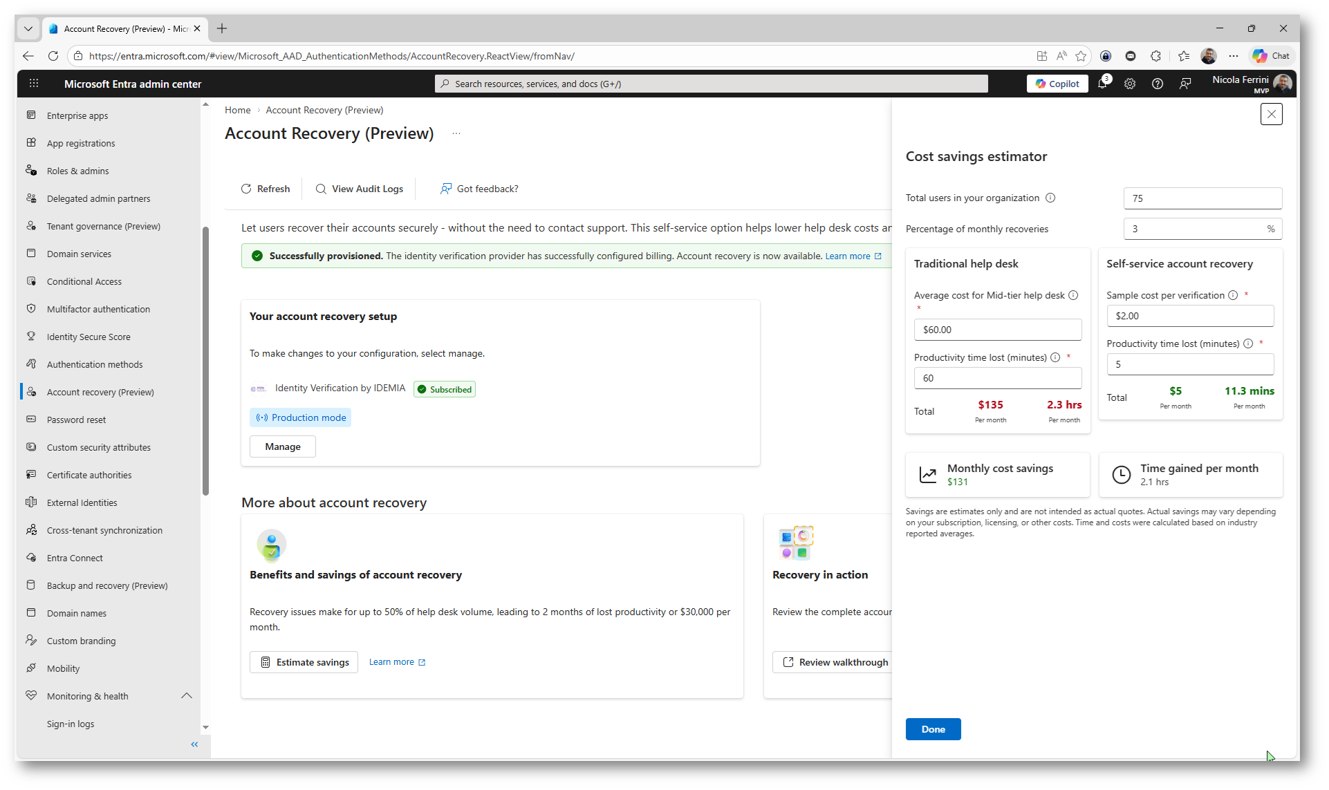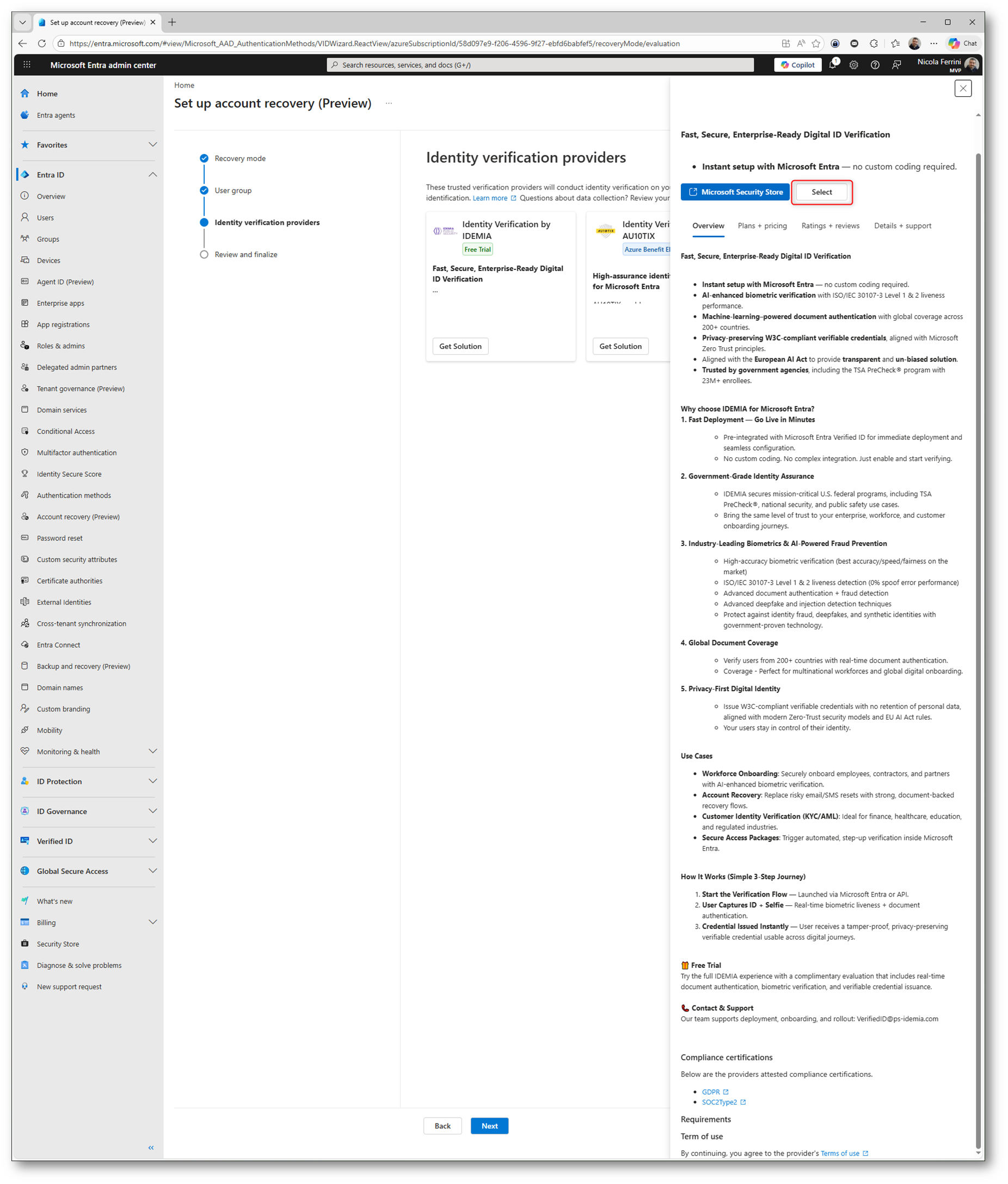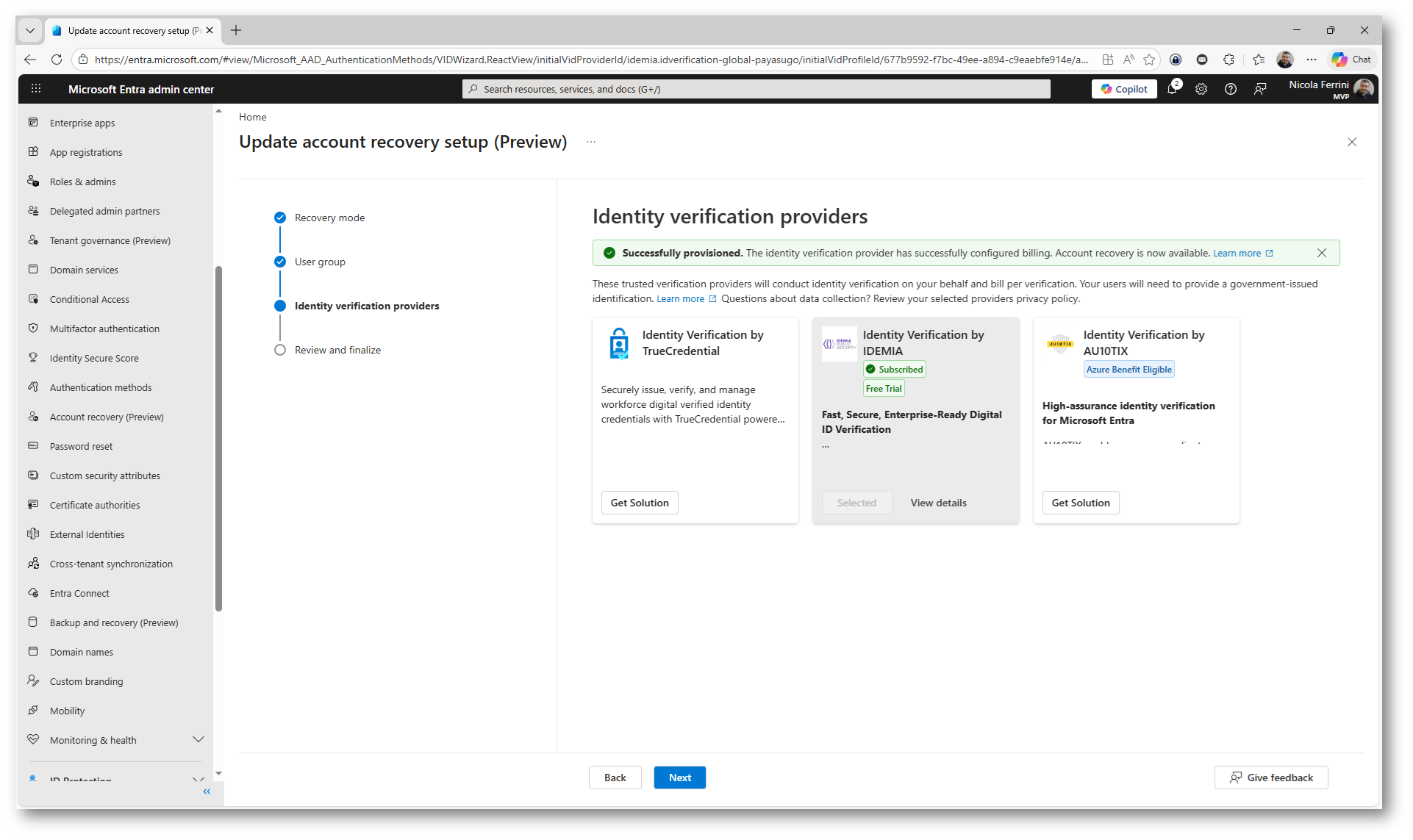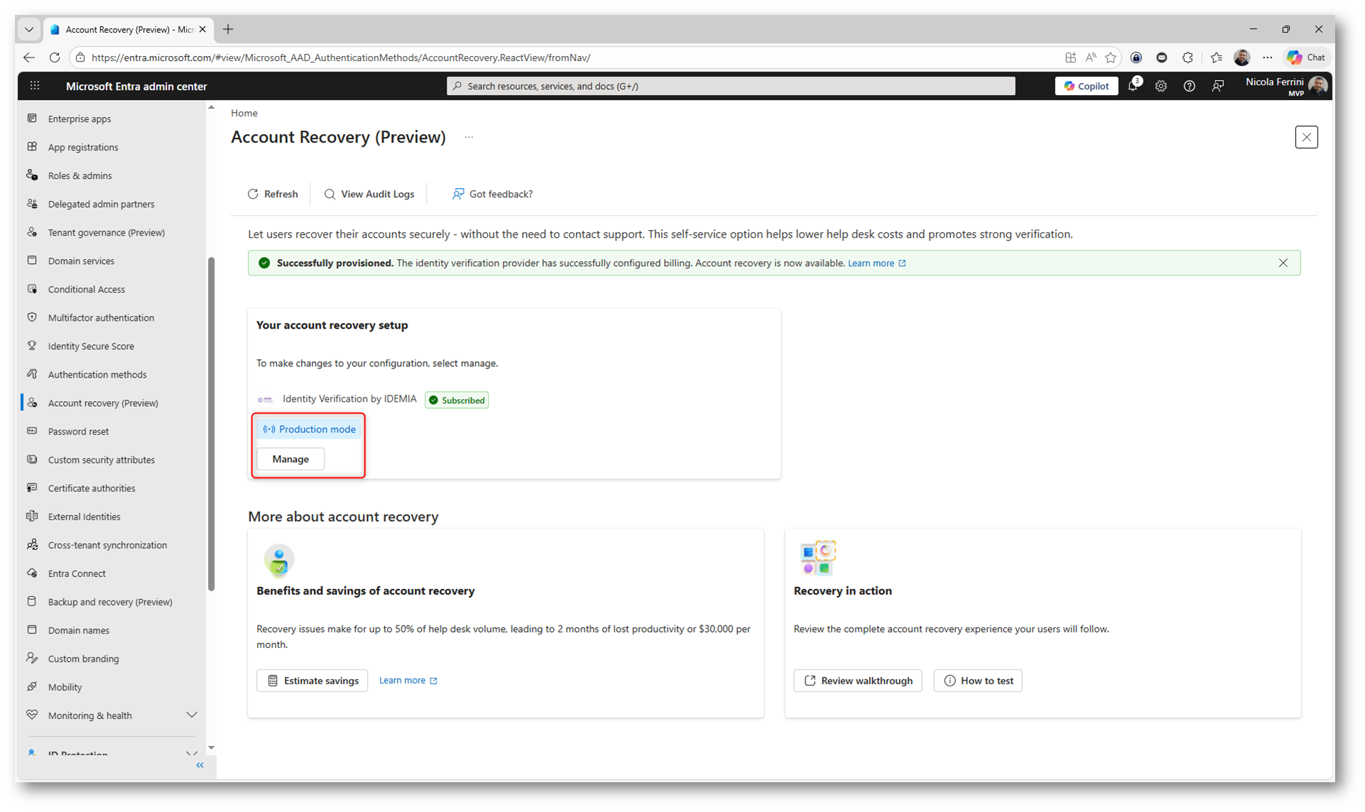 Una volta completato il wizard, la funzionalità di Account Recovery risulta attiva nel portale di Microsoft Entra ID. Potete verificare subito lo stato della configurazione: il provider IDEMIA è Subscribed e la modalità è impostata su Evaluation, pronta per essere testata.
