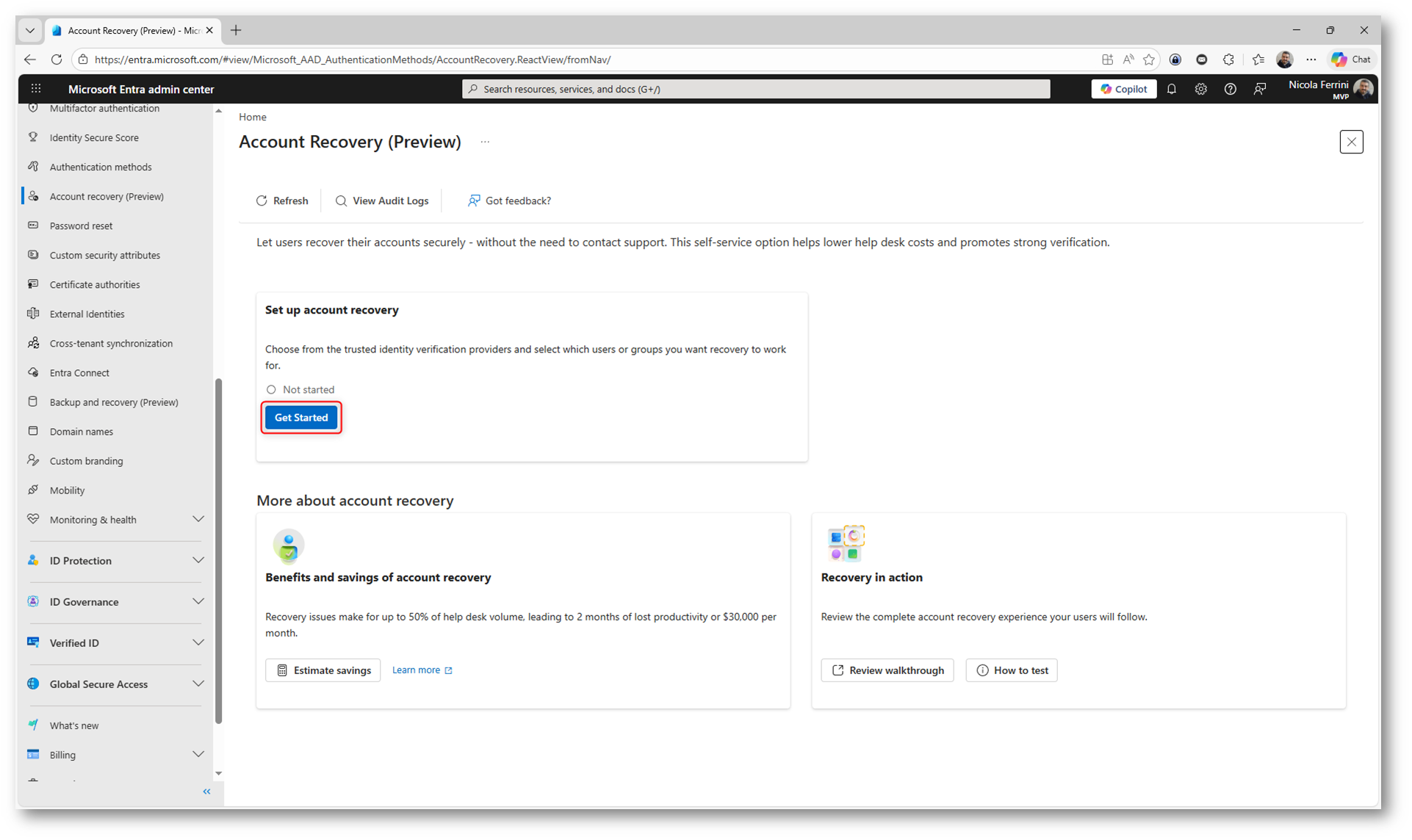 Figura 2: Avvio della configurazione di Account Recovery dal portale Microsoft Entra ID tramite il wizard “Get Started”