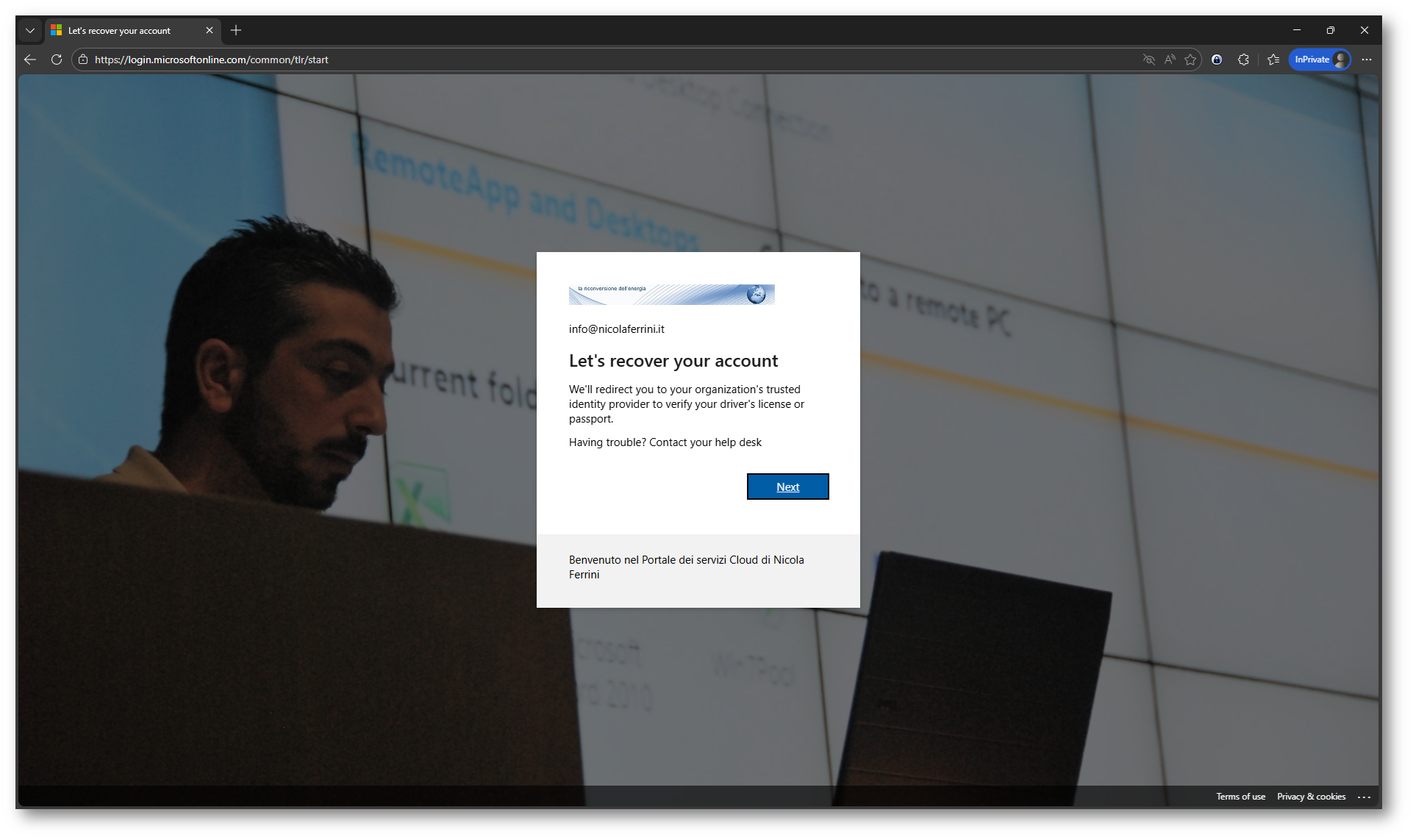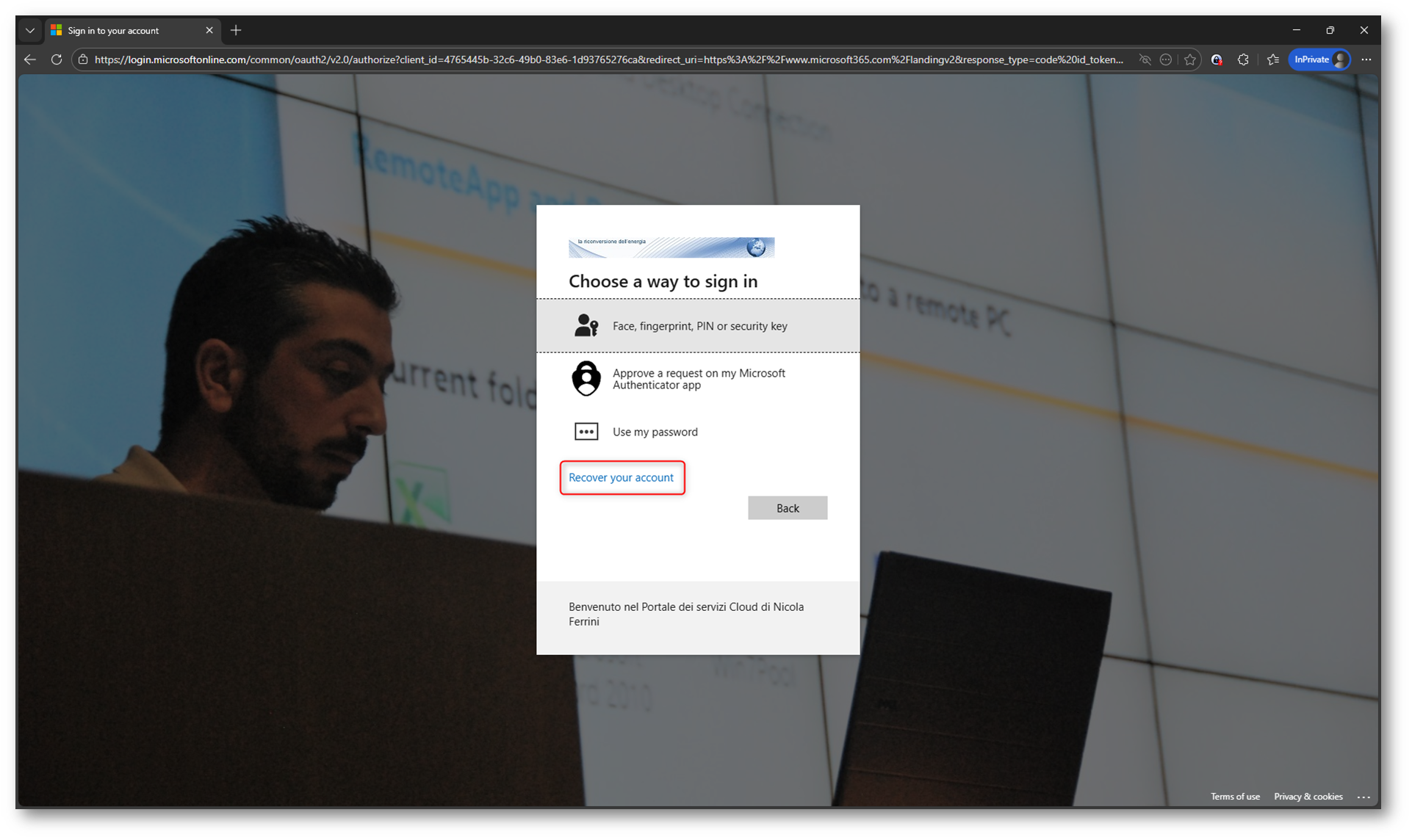 Quando l’utente non riesce ad accedere, può selezionare Recover your account direttamente dalla schermata di autenticazione, senza dover contattare l’helpdesk.