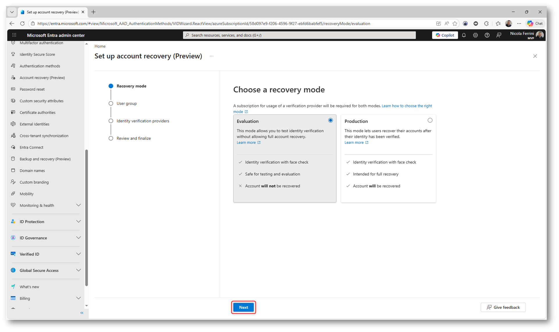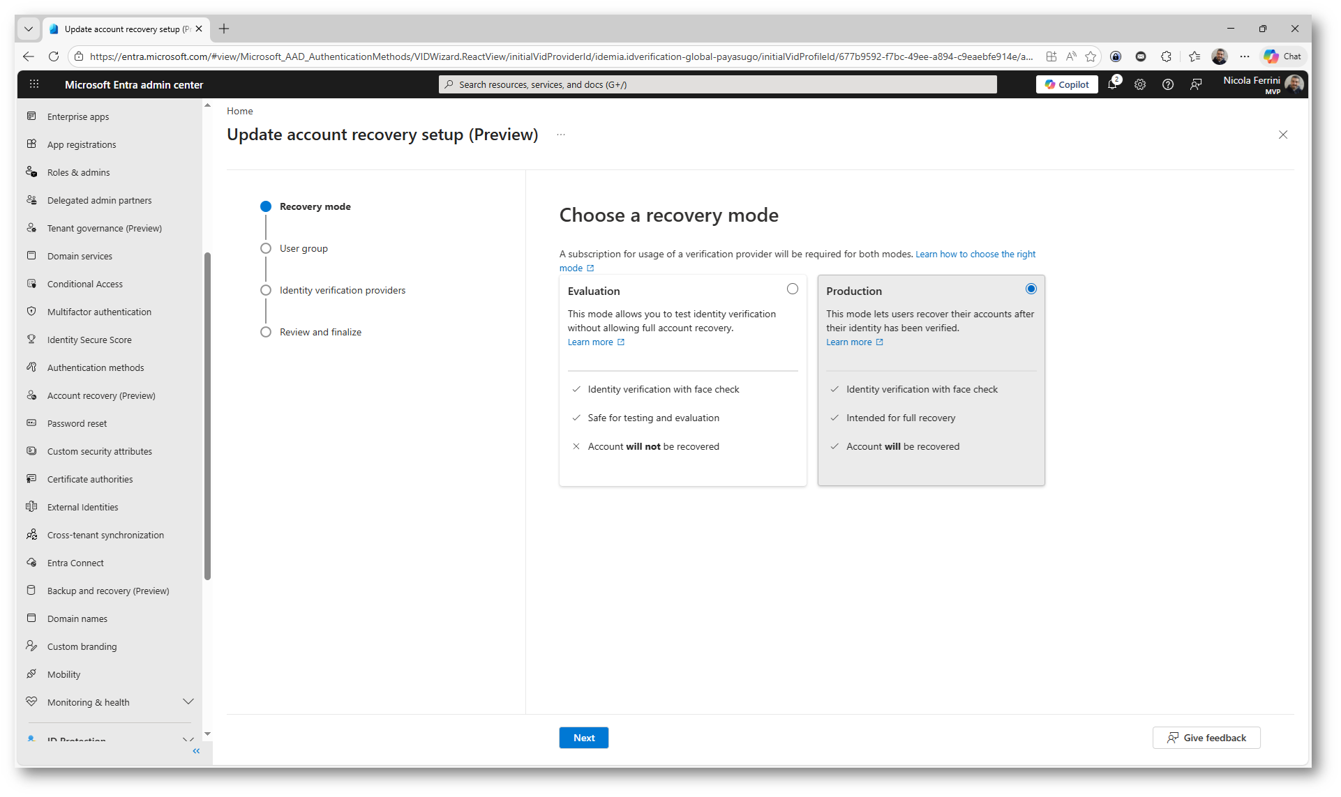 Per avere il comportamento completo, cioè permettere davvero il recupero dell’account tramite Verified ID, è necessario passare alla production mode. Solo in quel caso la credenziale verificata viene utilizzata come metodo di autenticazione valido.