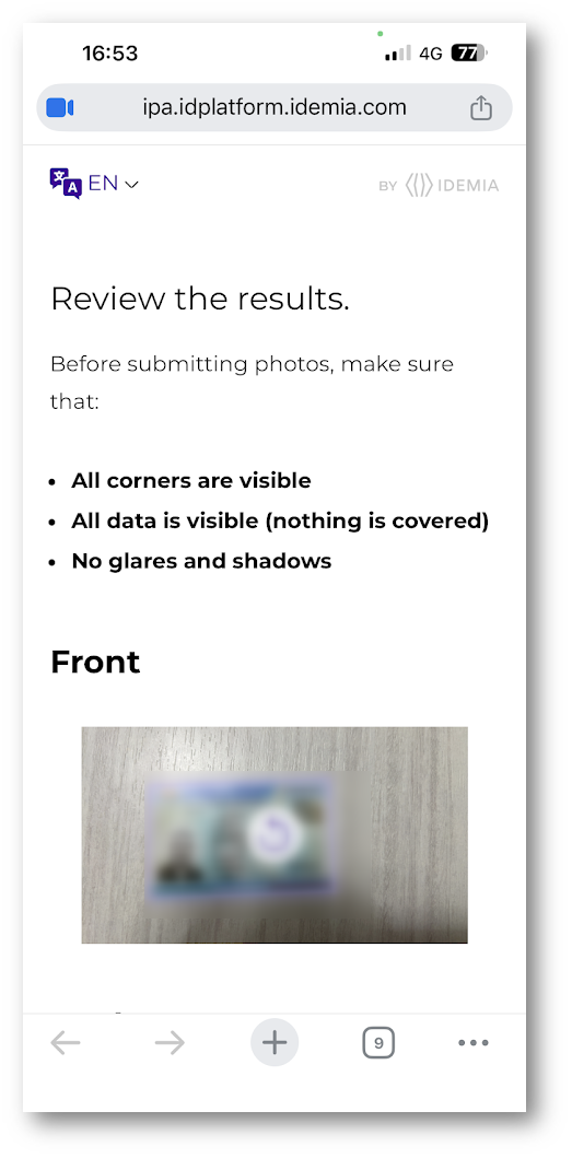 Sul dispositivo mobile avviene l’intero processo di verifica dell’identità, che è la parte più sensibile e critica del flusso. Dopo la scansione del QR code, il telefono apre una sessione sicura collegata a quella avviata nel browser e prende in carico la procedura. L’utente viene guidato passo dopo passo dall’applicazione di IDEMIA, che utilizza la fotocamera del dispositivo per acquisire il documento di identità, come carta d’identità, patente o passaporto.