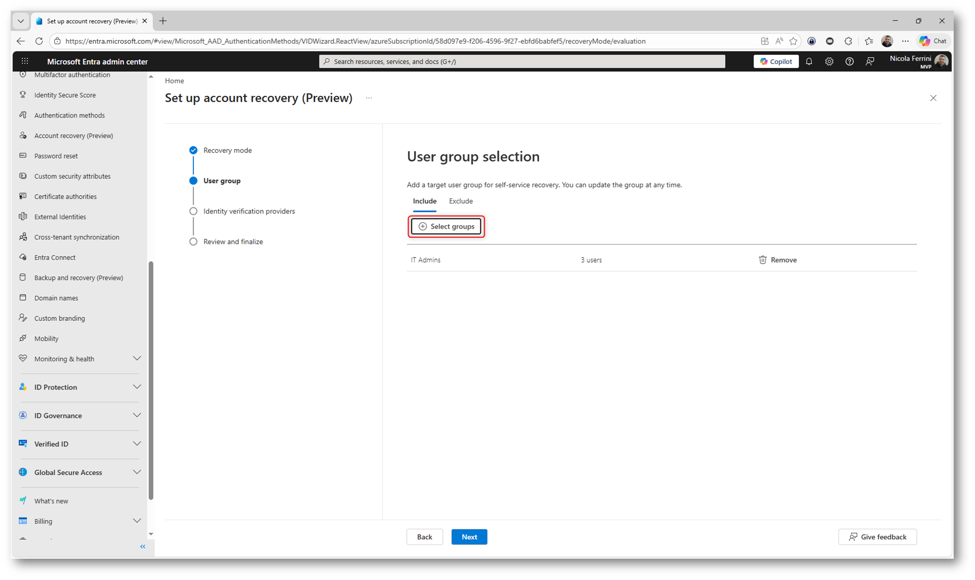 Figura 4: Selezione dei gruppi di sicurezza per abilitare il Self-Service Account Recovery agli utenti target