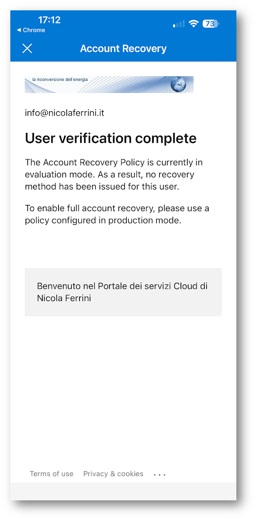 Una volta completata la configurazione, il flusso di account recovery entra in modalità Production e diventa effettivamente disponibile agli utenti finali. A differenza della fase di evaluation, in questo scenario il processo non è più solo dimostrativo: dopo la verifica dell’identità, l’utente può realmente recuperare l’accesso al proprio account.