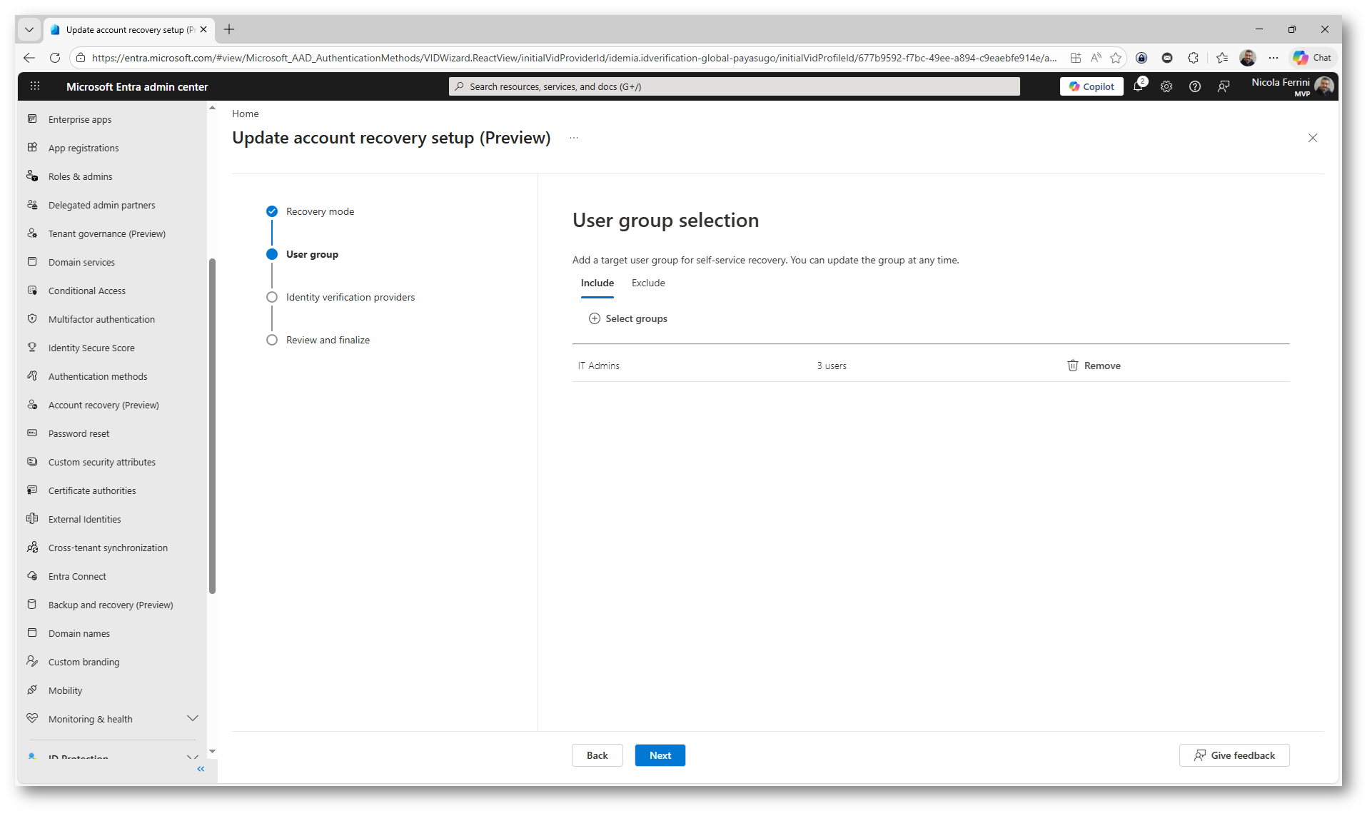 Il terzo elemento è la configurazione in Microsoft Entra ID, dove definite le regole del processo. Tramite un wizard dedicato potete stabilire chi può utilizzare il recupero account, quali provider sono considerati trusted e quali requisiti devono essere soddisfatti.