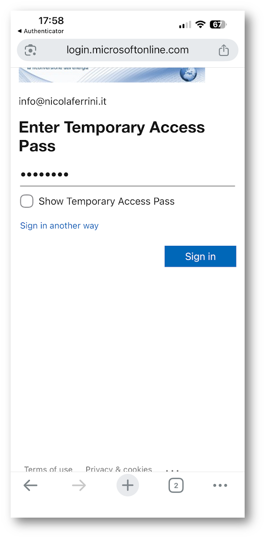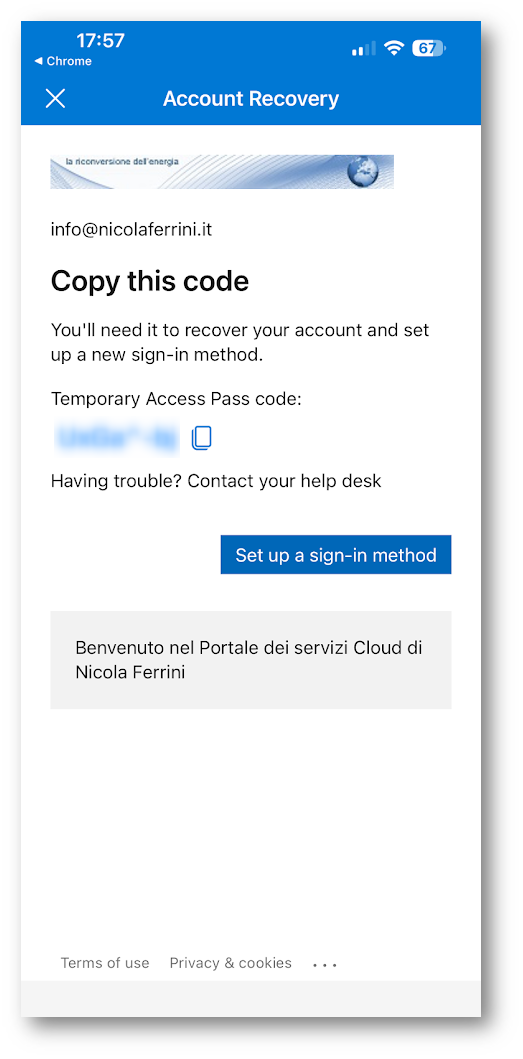 Dopo la verifica dell’identità, l’utente visualizza un Temporary Access Pass, che rappresenta una credenziale temporanea necessaria per riprendere il controllo dell’account. Questo codice viene copiato o utilizzato immediatamente per autenticarsi e avviare la fase successiva.
