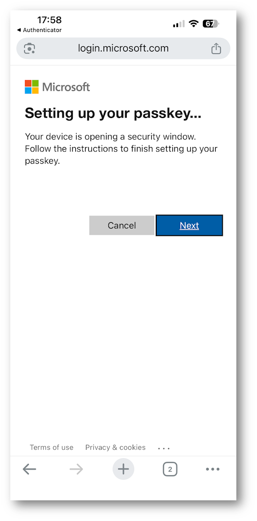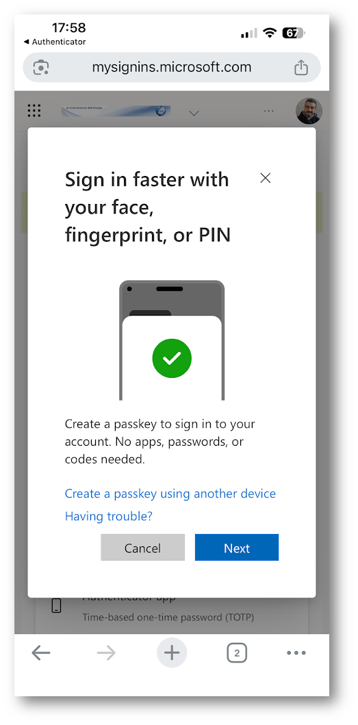A questo punto il sistema guida l’utente nella configurazione di un nuovo metodo di accesso. Viene quindi proposta la creazione di una passkey, sfruttando i meccanismi nativi del dispositivo come biometria (volto o impronta) oppure PIN. L’utente conferma l’operazione direttamente sullo smartphone, senza necessità di password tradizionali.