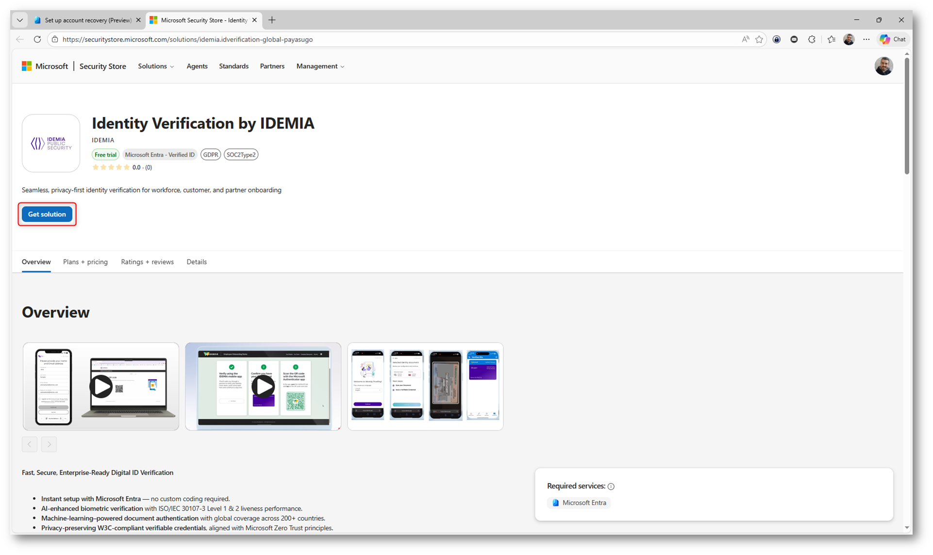 Dopo aver selezionato il provider, venite reindirizzati al Microsoft Security Store, dove potete attivare il servizio. Da qui dovete cliccare su Get solution per iniziare l’integrazione con il vostro tenant di Microsoft Entra ID.