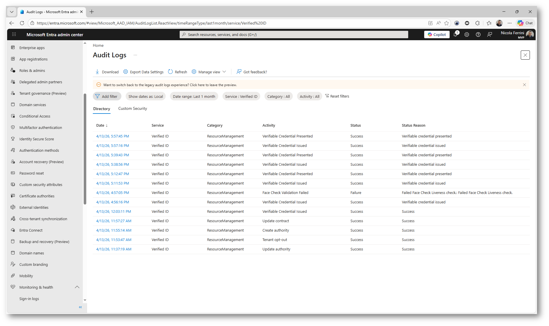 Qui sono visibili tutti gli eventi associati al servizio Verified ID, inclusi i passaggi chiave del processo come l’emissione della verifiable credential, la sua presentazione e l’esito dei controlli di sicurezza, come il face check. Ogni evento è corredato da informazioni dettagliate, tra cui timestamp, attività eseguita, stato (successo o fallimento) e relativa motivazione.
