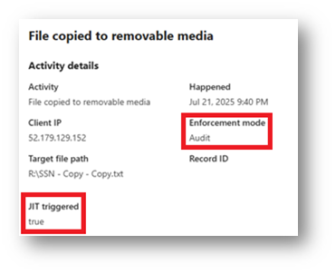 • JIT Audit: per il file “candidato” JIT Endpoint DLP genera un evento in Activity Explorer dove JIT Attivato è impostato su “True” e la modalità di Enforcement su Audit.