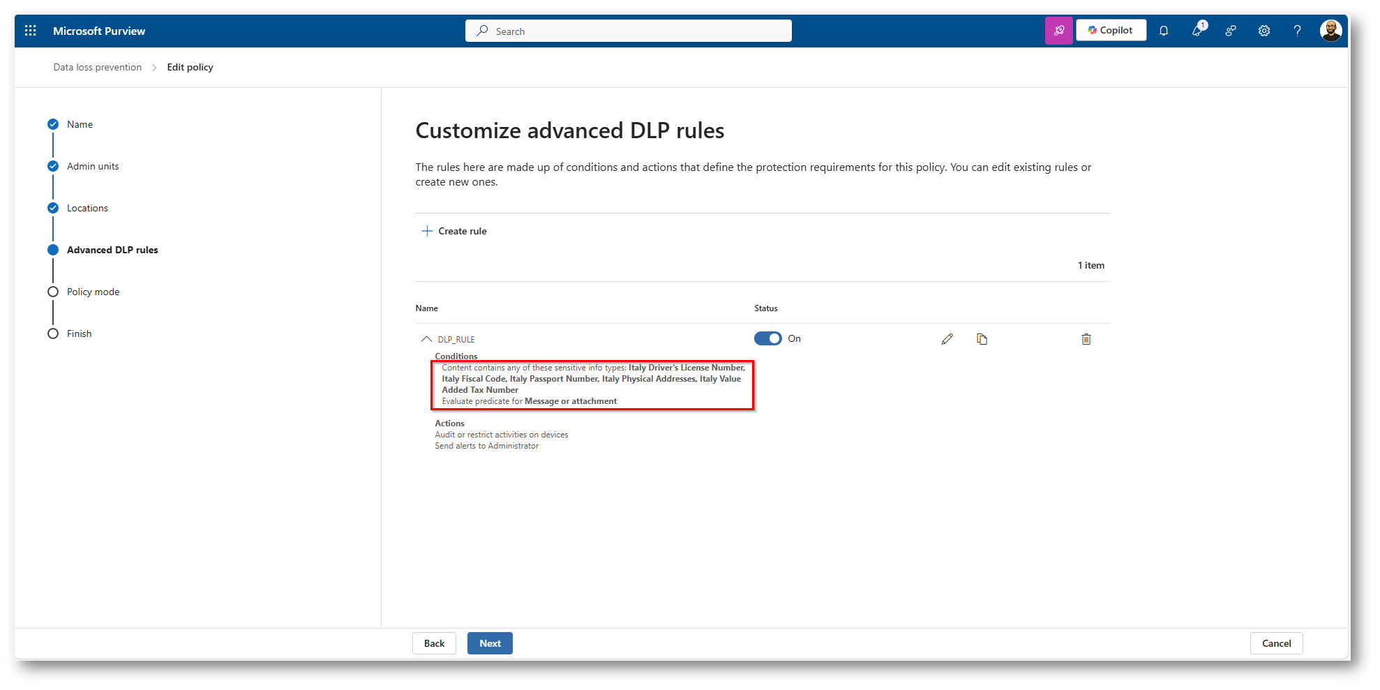 Figure 10: Regola DLP per eseguire il match dei documenti sensibili di demo