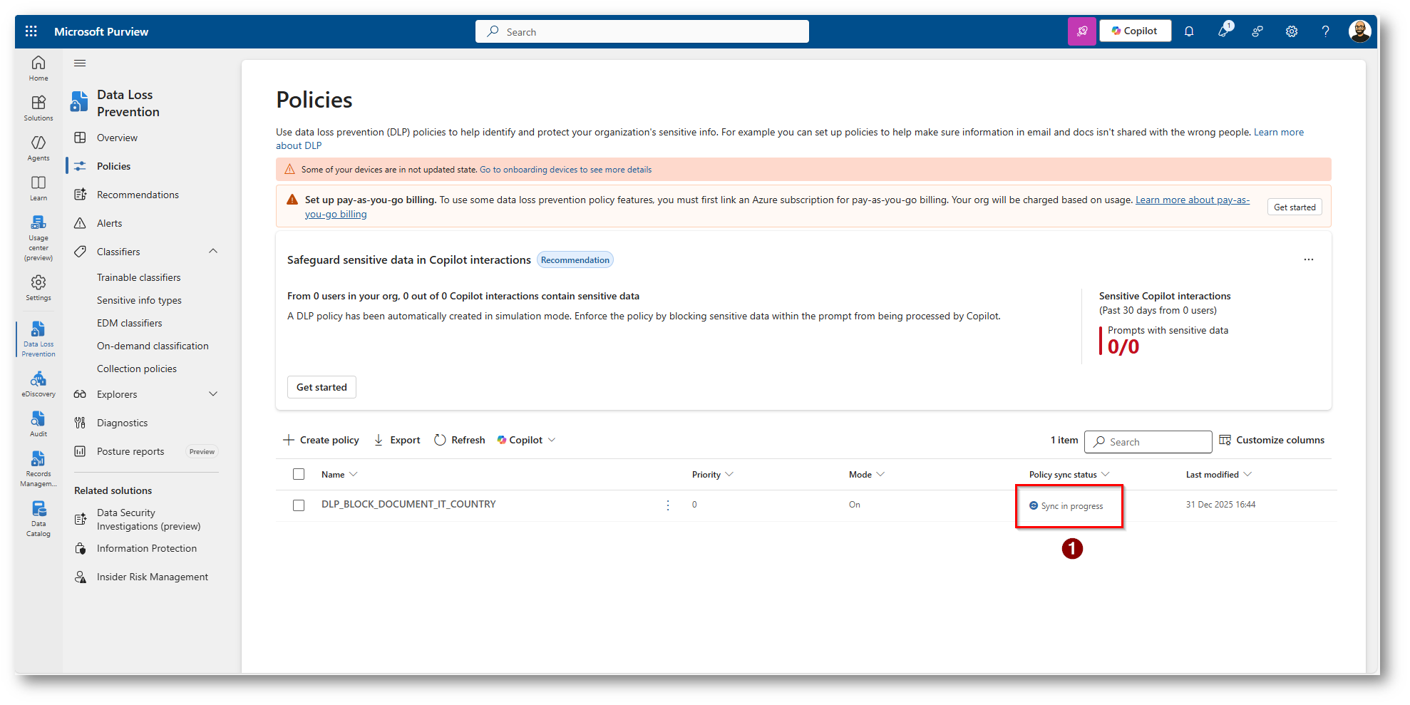 Figura 21: Messaggio di Evaluation che compare all’utente nonostante la Policy di DLP risulti ancora in Synced