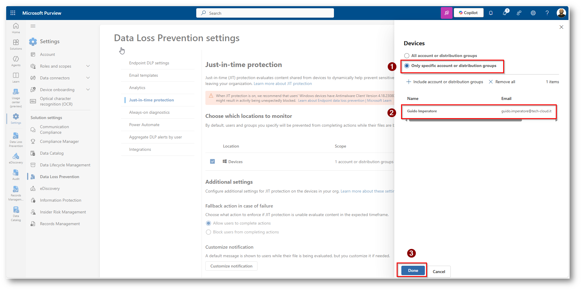 La funzionalità Just-In-Time (JIT) Protection di Microsoft Purview DLP consente di applicare le policy di protezione dei dati in modo dinamico e contestuale, intervenendo solo quando si verifica un reale rischio di perdita delle informazioni. Questo approccio permette di migliorare la sicurezza riducendo al minimo l’impatto sull’operatività degli utenti. Grazie a JIT Protection, le organizzazioni possono prevenire la perdita di dati sensibili in tempo reale, aumentare la consapevolezza degli utenti e adottare una strategia di sicurezza più moderna, flessibile ed efficace.