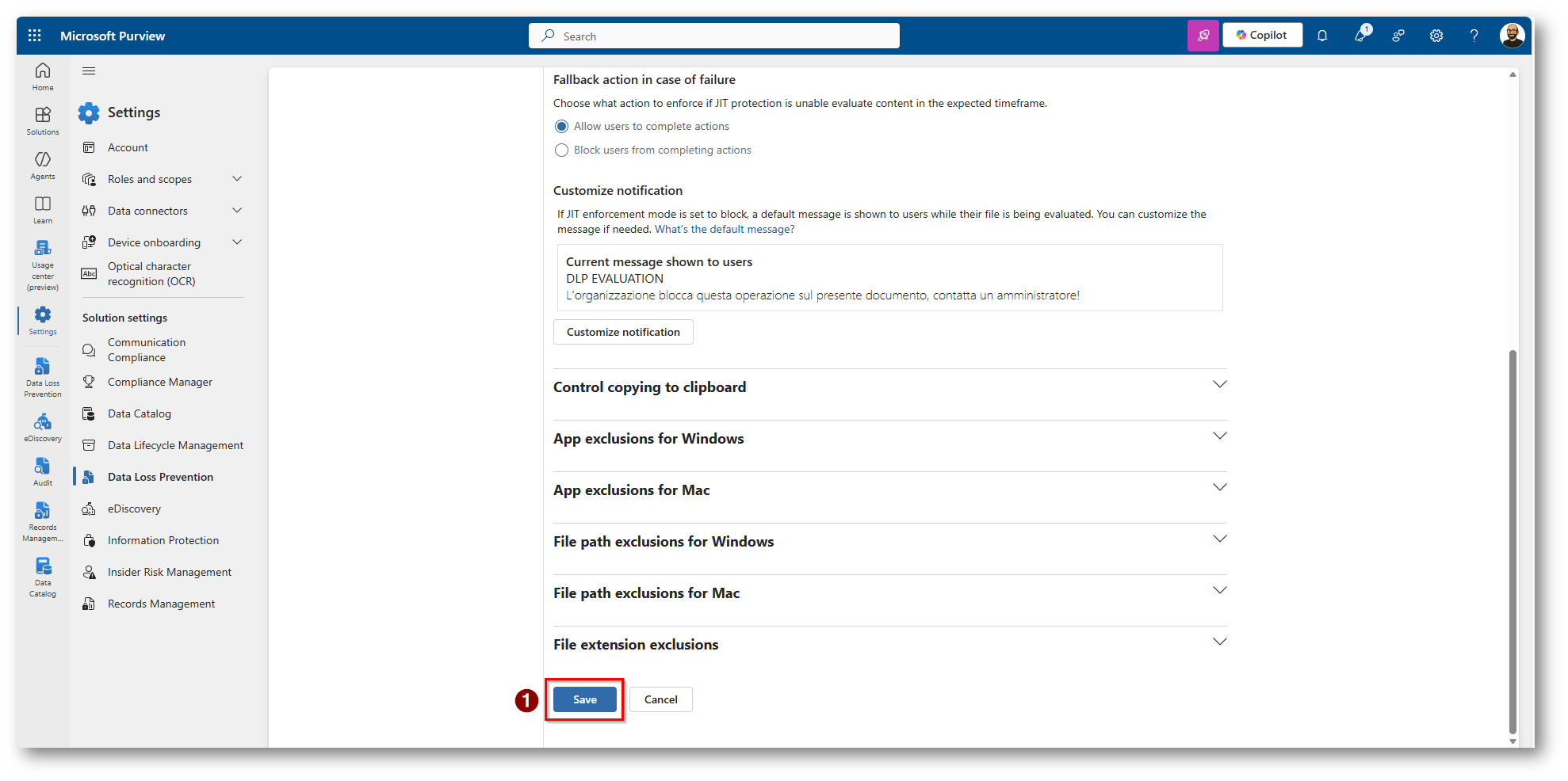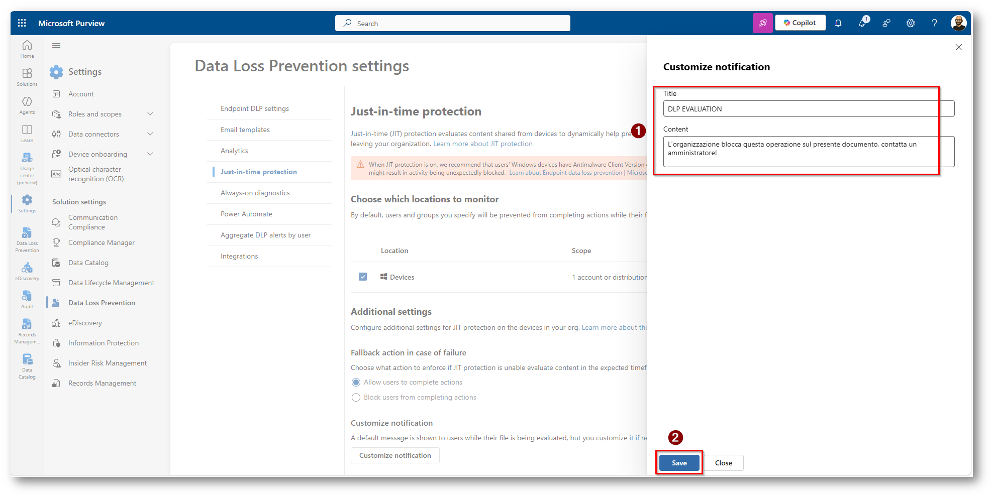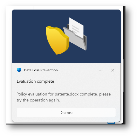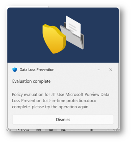 JIT evaluation complete notification: quando DLP termina la valutazione della policy per un file candidato JIT, Endpoint DLP mostra una notifica per informare l’utente.