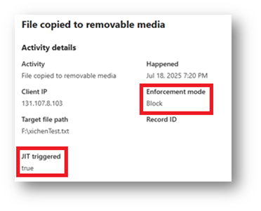 JIT Block: per il file “candidato” JIT, Endpoint DLP blocca l’attività e genera un evento in Activity Explorer se JIT attivato è impostato su True e la modalità di Enforcement su Block, ma non genera nessun evento di DLP Rule Match.