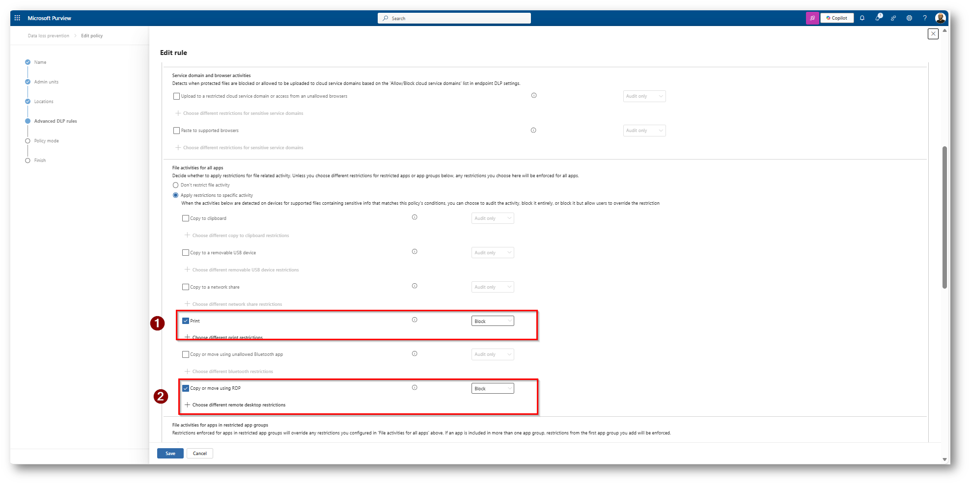 Figure 9: Policy DLP applicata al device che blocca la copia in RDP e la stampa dei documenti