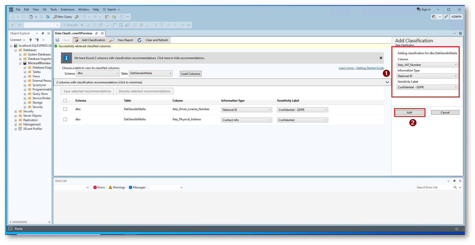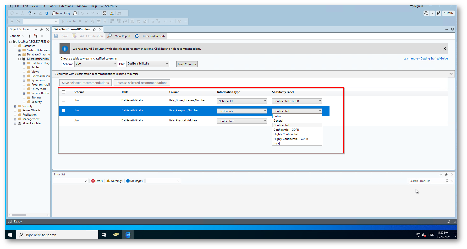 Questa operazione può essere eseguita tramite T-SQL o usando SQL Server Managament Studio (SSMS). L’individuazione e la classificazione dei dati più sensibili, come i dati aziendali, finanziari, medici e così via può avere un ruolo fondamentale nella protezione delle informazioni delle organizzazioni.