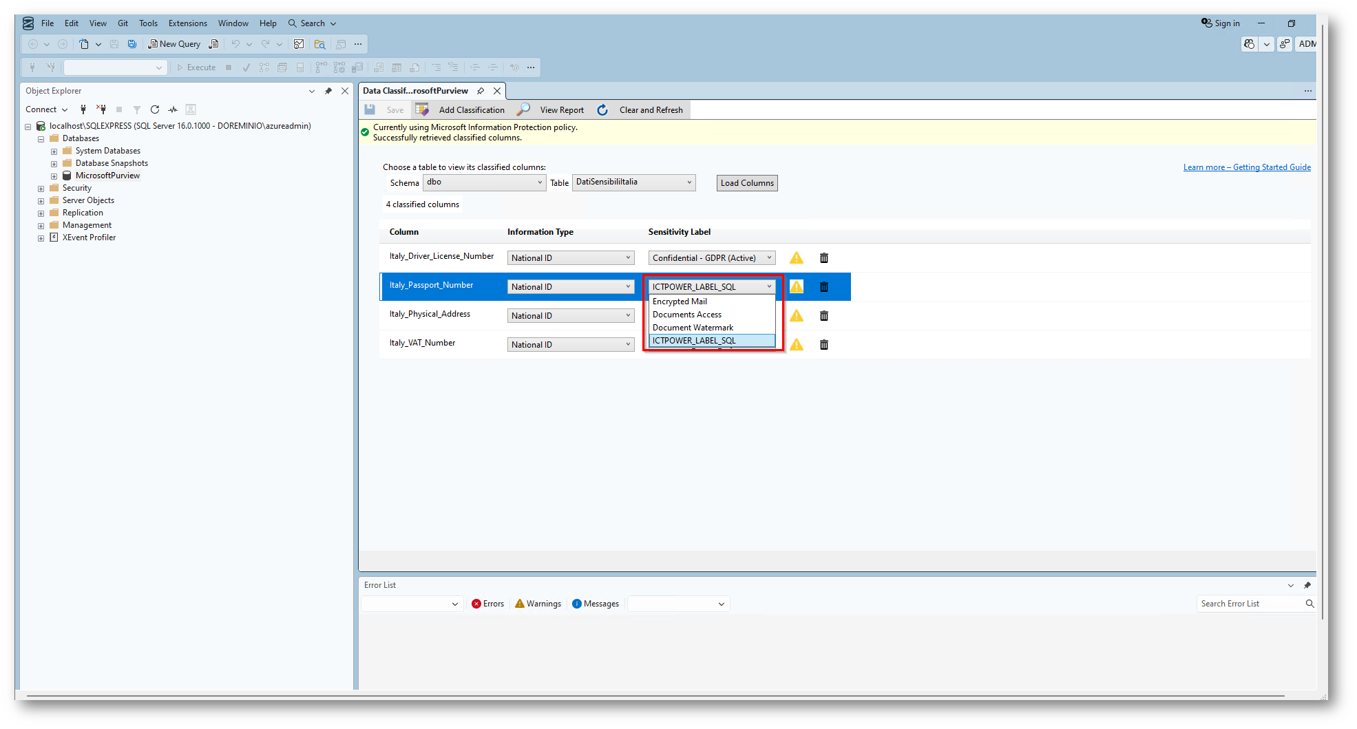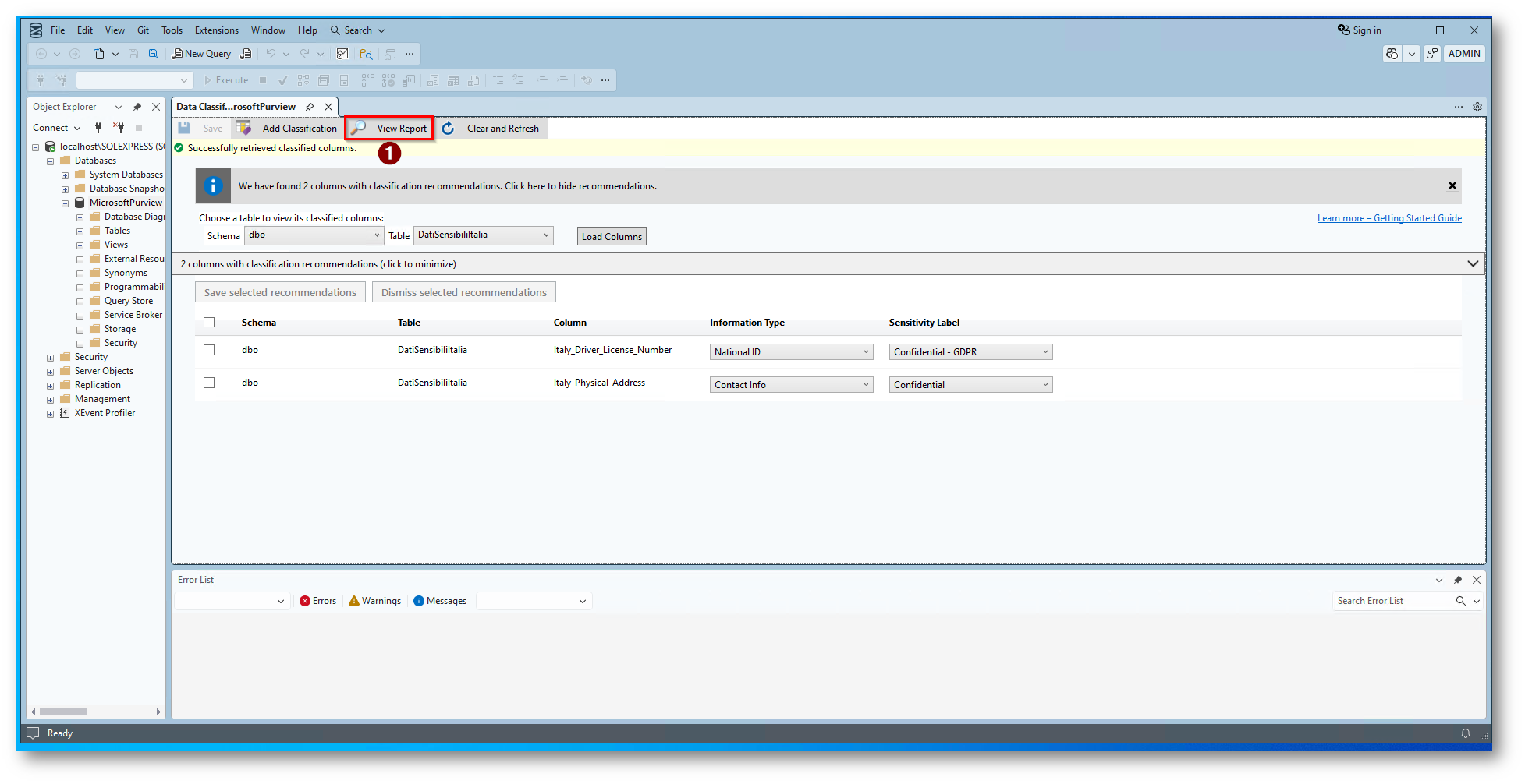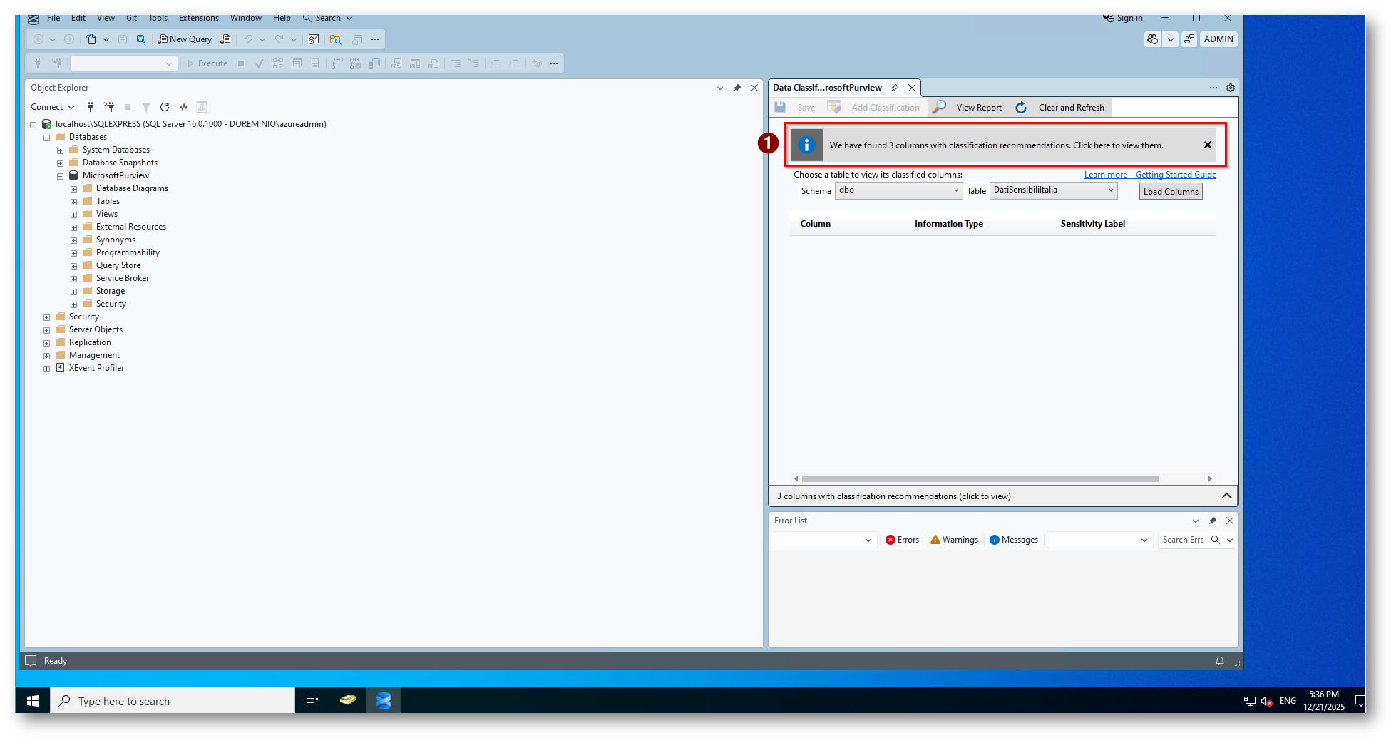 Data Discovery & Classification tramite SQL Server Management Studio
