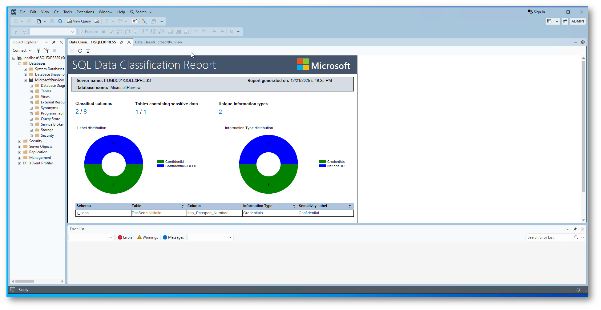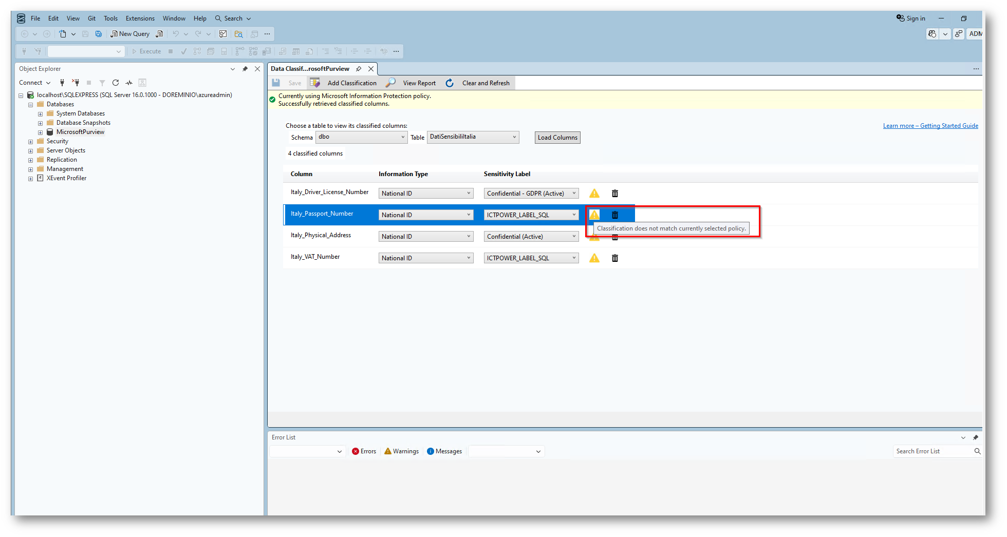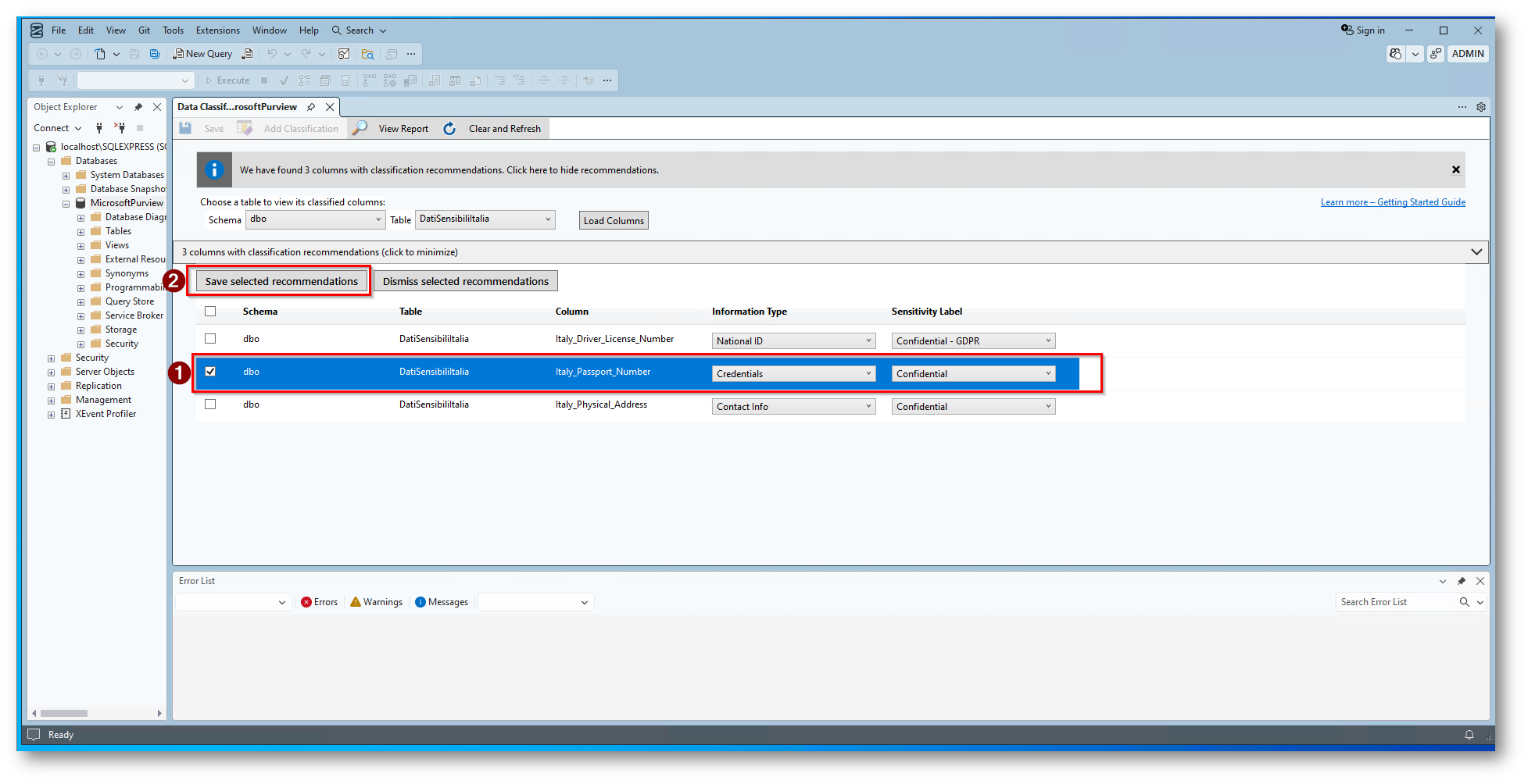 Data Discovery & Classification tramite SQL Server Management Studio