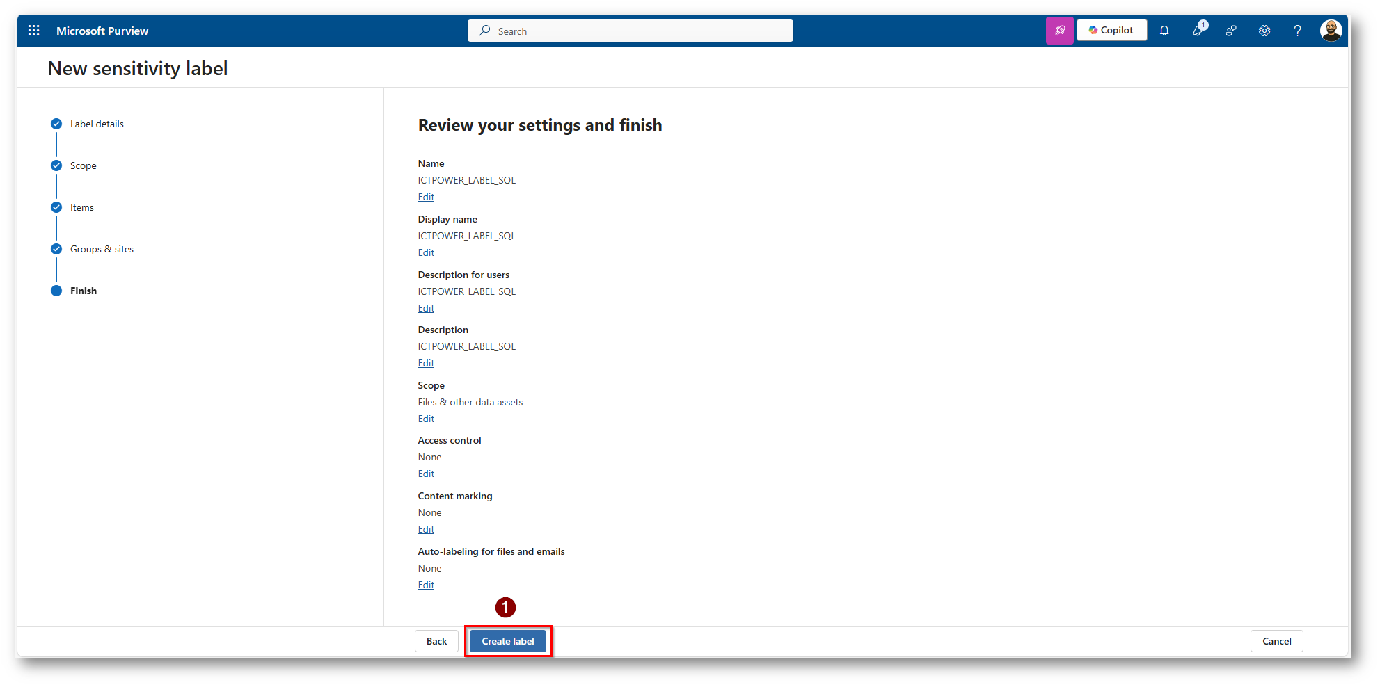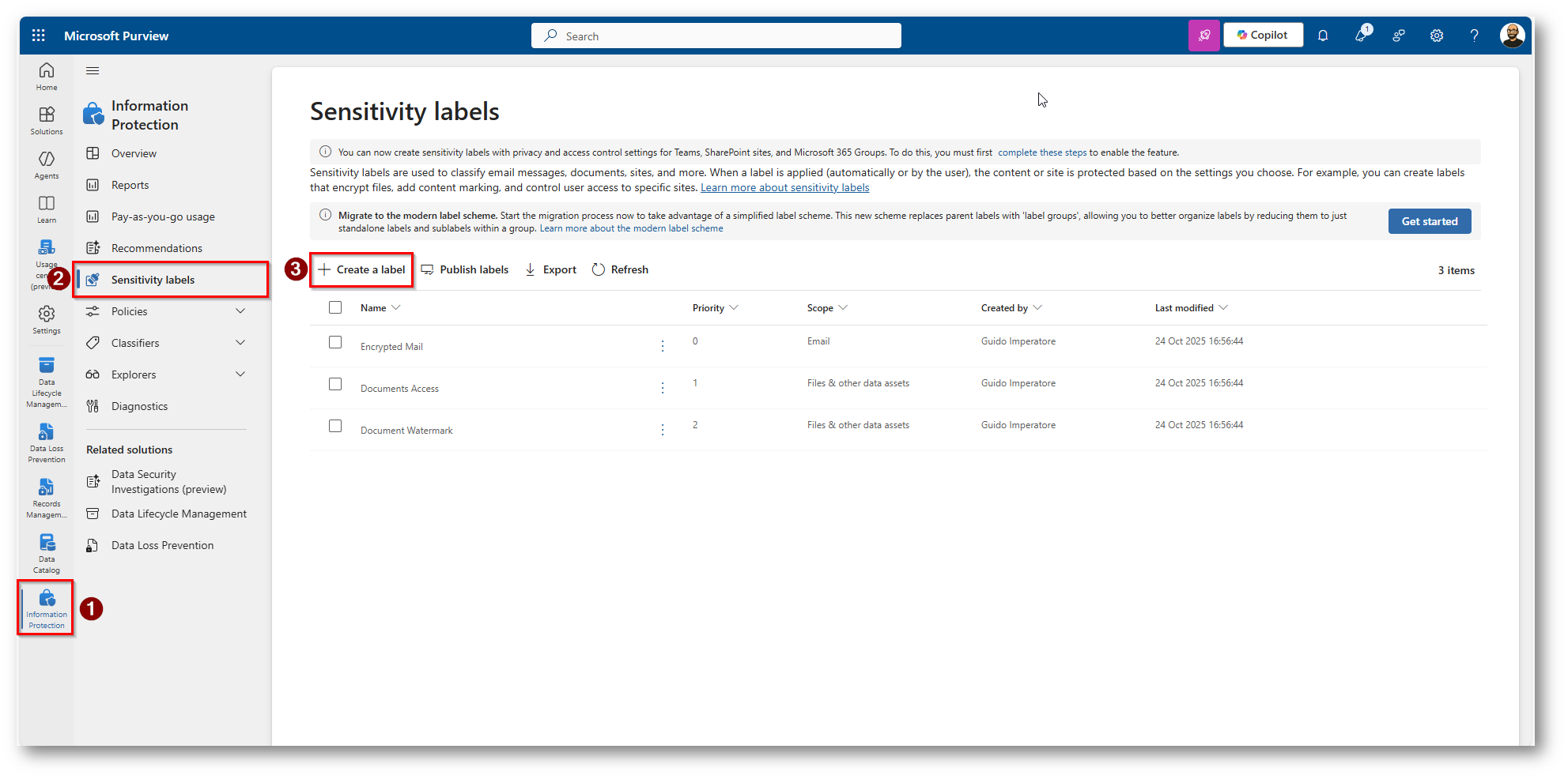 Procediamo a creare una Sensitivity Label in Microsoft Purview per classificare la nostra tabella in SQL Server