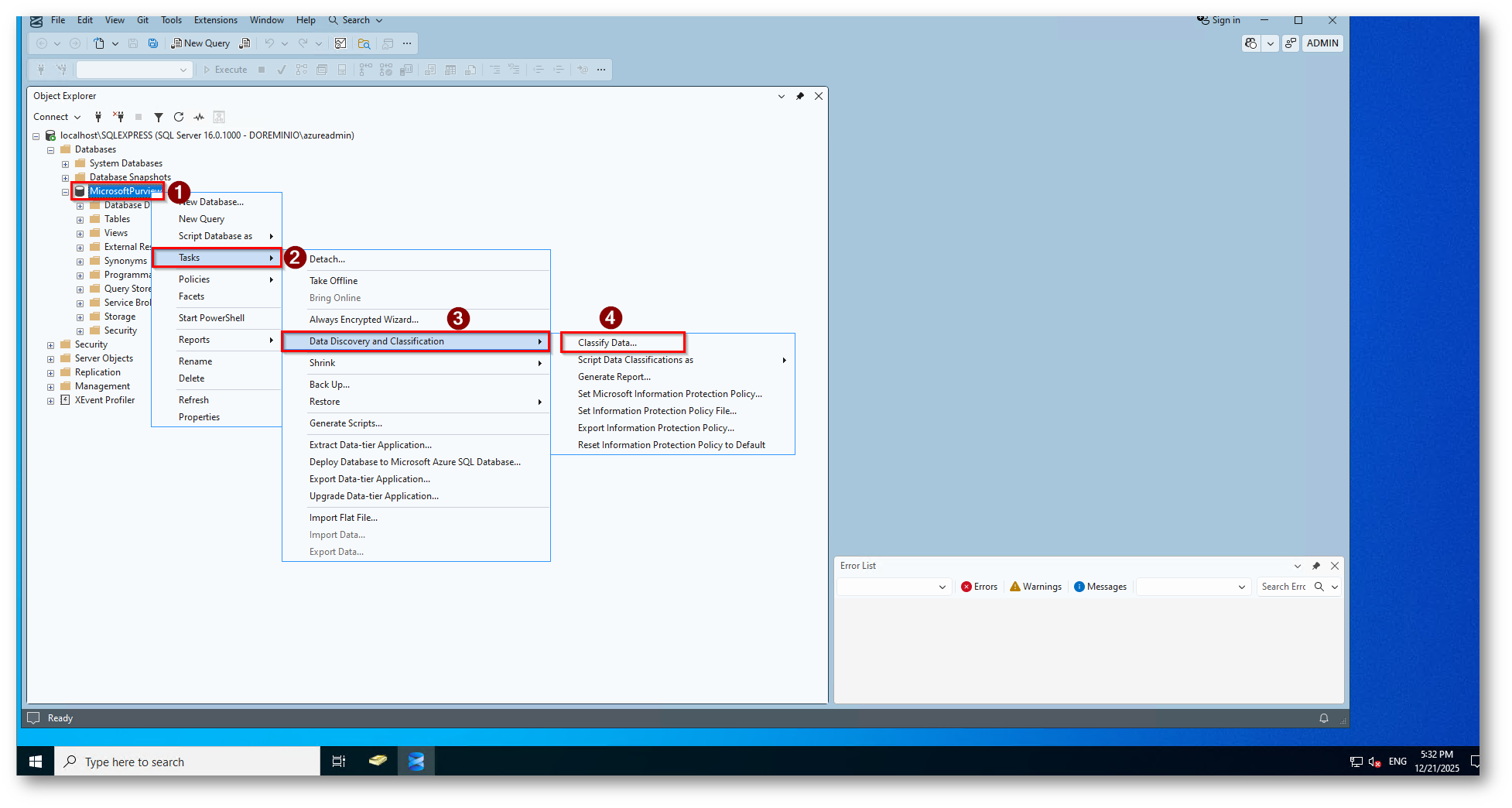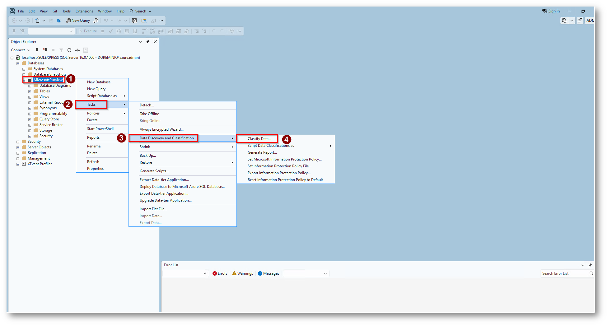 Figura 8: Click destro sul database Task, Data Discovery e Classify Data