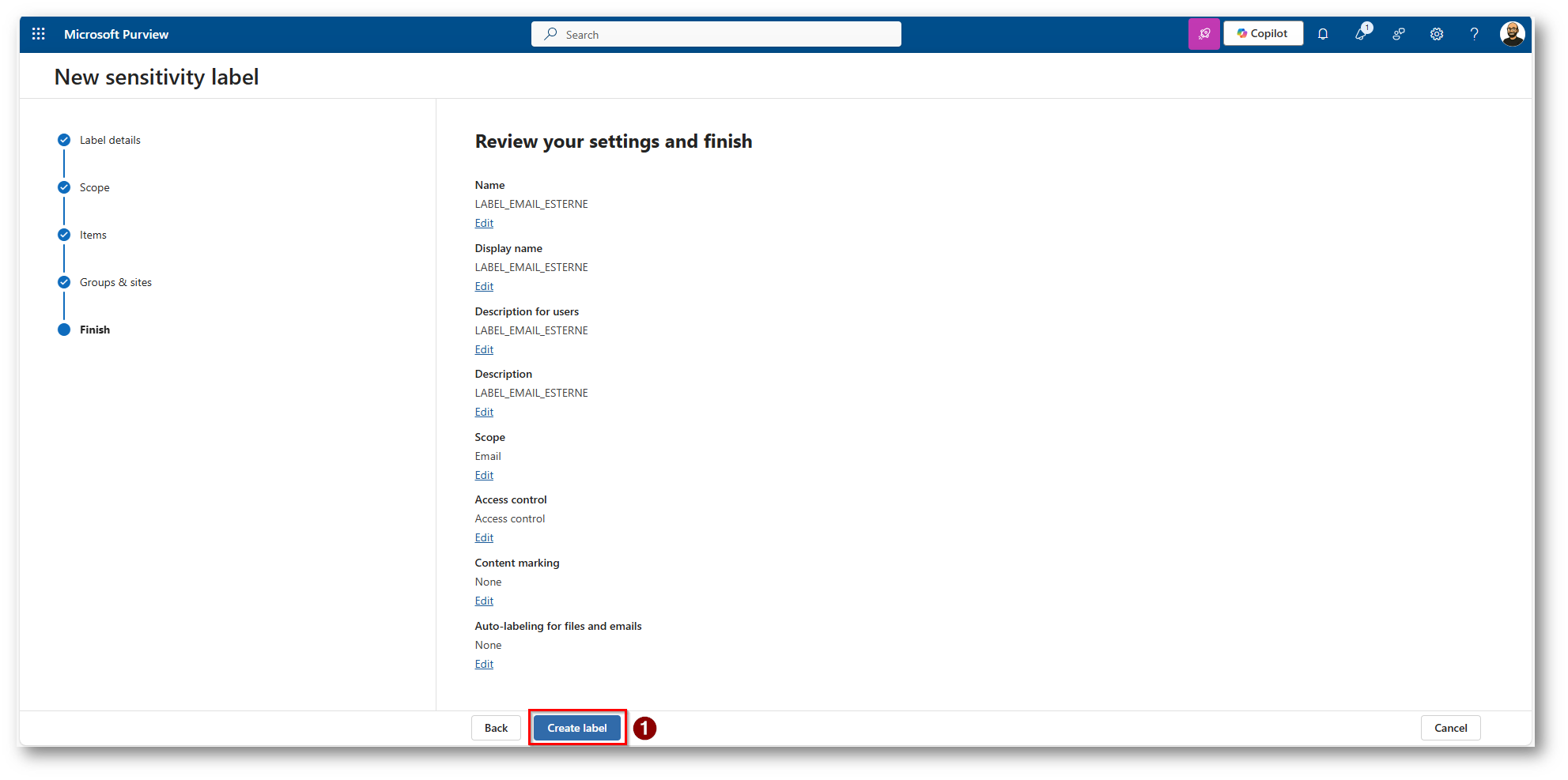 Figura 11: Review delle configurazioni attuate e creazione della Label