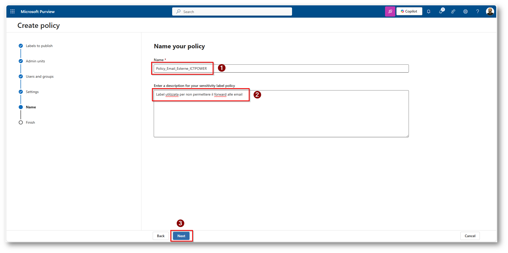Figura 25: Scegliamo nome e descrizione parlante per la policy