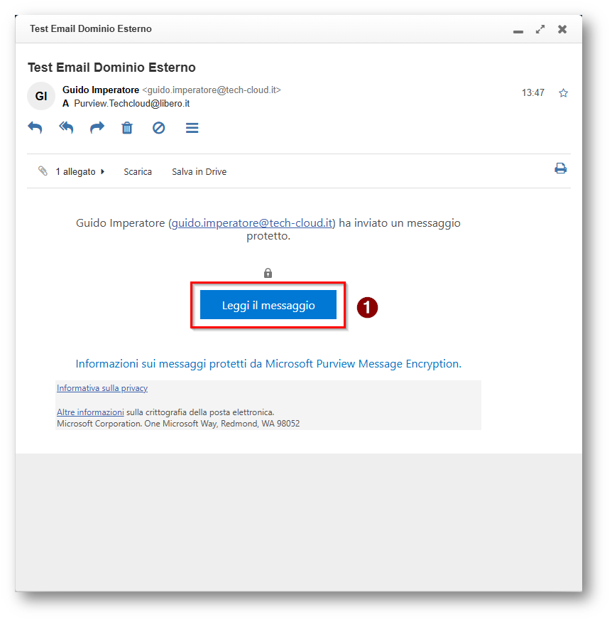 Figura 32: Mail ricevuta dal destinatario, essendo un indirizzo esterno a Microsoft 365 la mail sarà visualizzabile via web