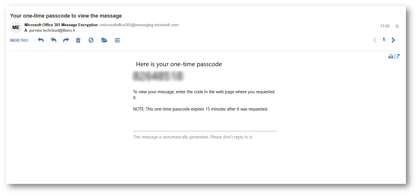 Figura 35: Email con codice monouso per accesso alla mail