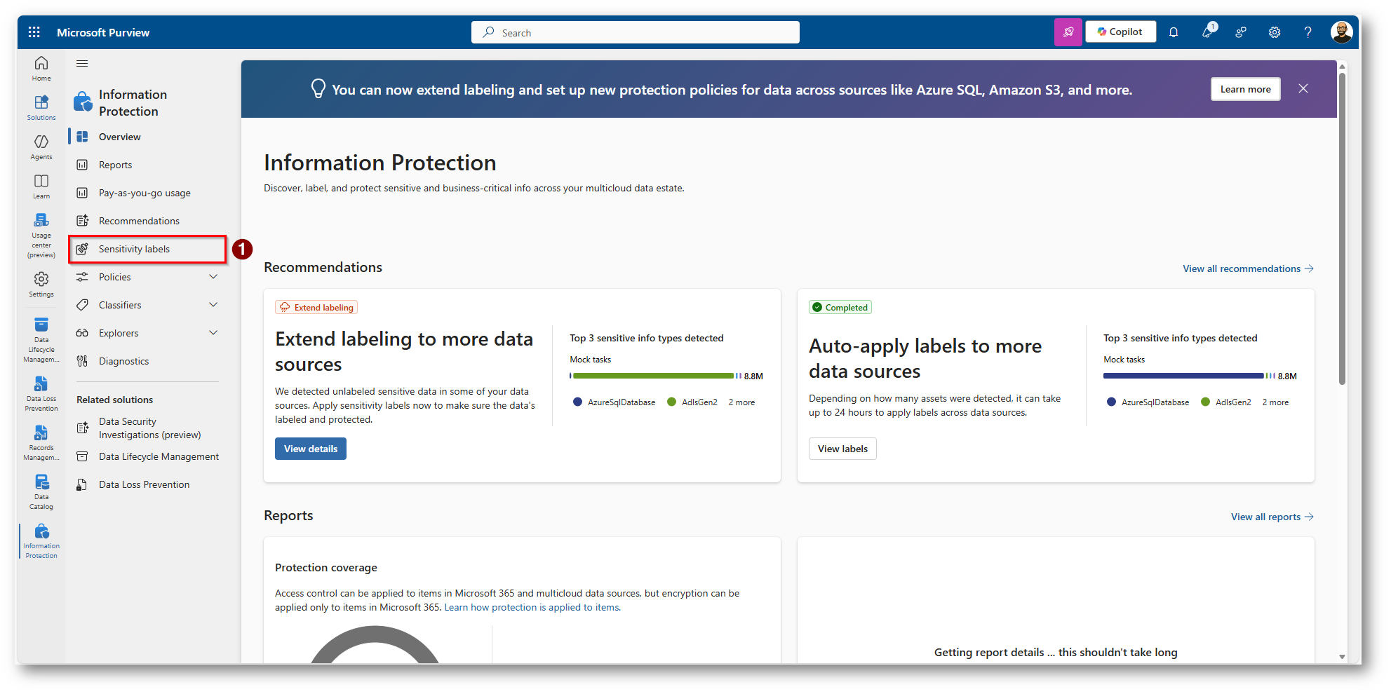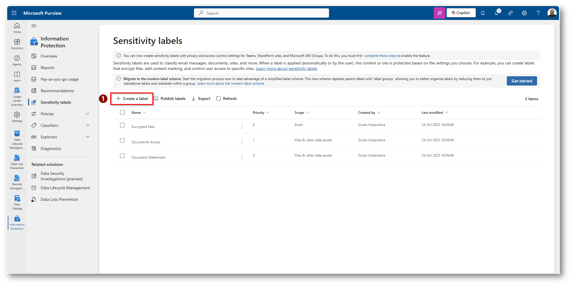 Figura 3: Click su “Sensitivity Labels” per la creazione di una Label