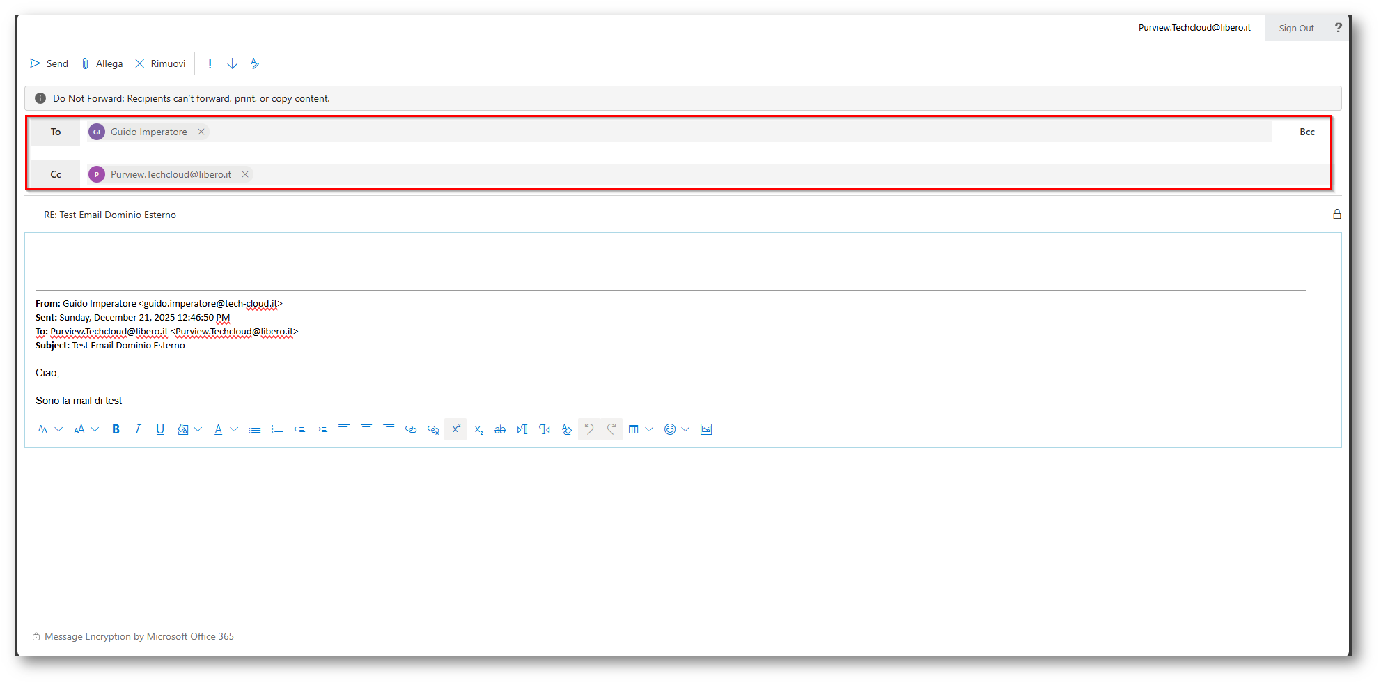 Molte persone della community in alcuni eventi mi hanno chiesto: ma se invio una mail con Encryption per non permettere il forward ad un account che non sia Microsoft 365 cosa succede?