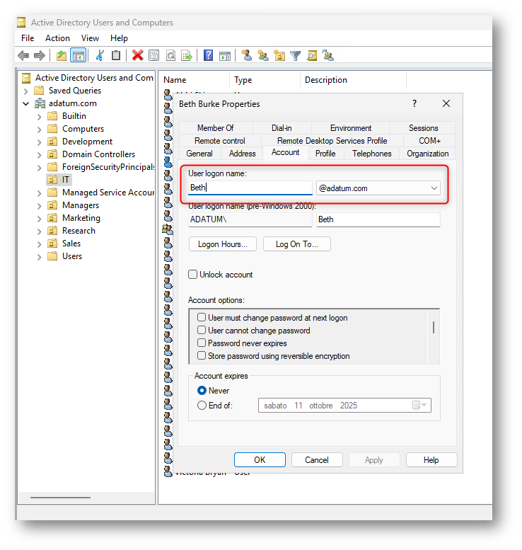 • Se vedi che [email protected] risulta Validated=True, significa che il sistema ha fatto fallback e in realtà ha autenticato ADATUM\beth.