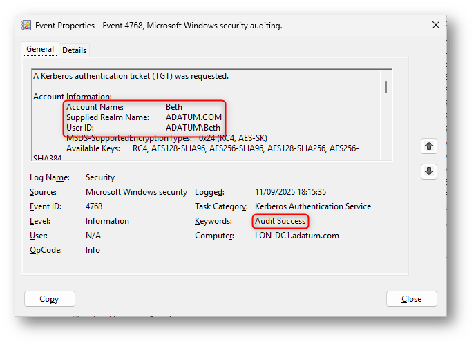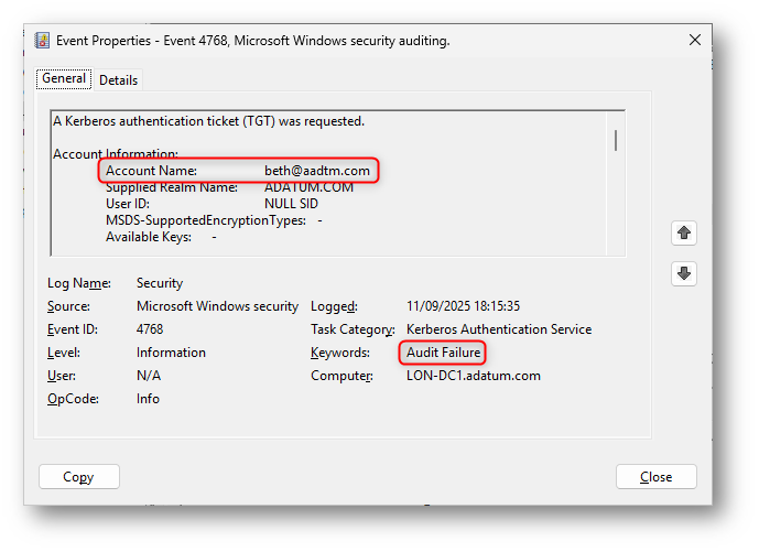 • Audit e forensic: nei log di sicurezza del DC, il tentativo appare come [email protected] (UPN errato), ma l’accesso effettivo registrato è ADATUM\beth. Un analista che indaga su un incidente può trovarsi davanti a eventi incoerenti: input diverso dall’account realmente autenticato, con il rischio di sottovalutare o interpretare male l’attacco.