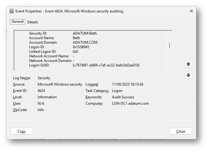 • Subito dopo, se avviene il fallback, il Domain Controller registrerà un logon riuscito (4624 – Logon success) dove l’account effettivo autenticato sarà ADATUM\beth.