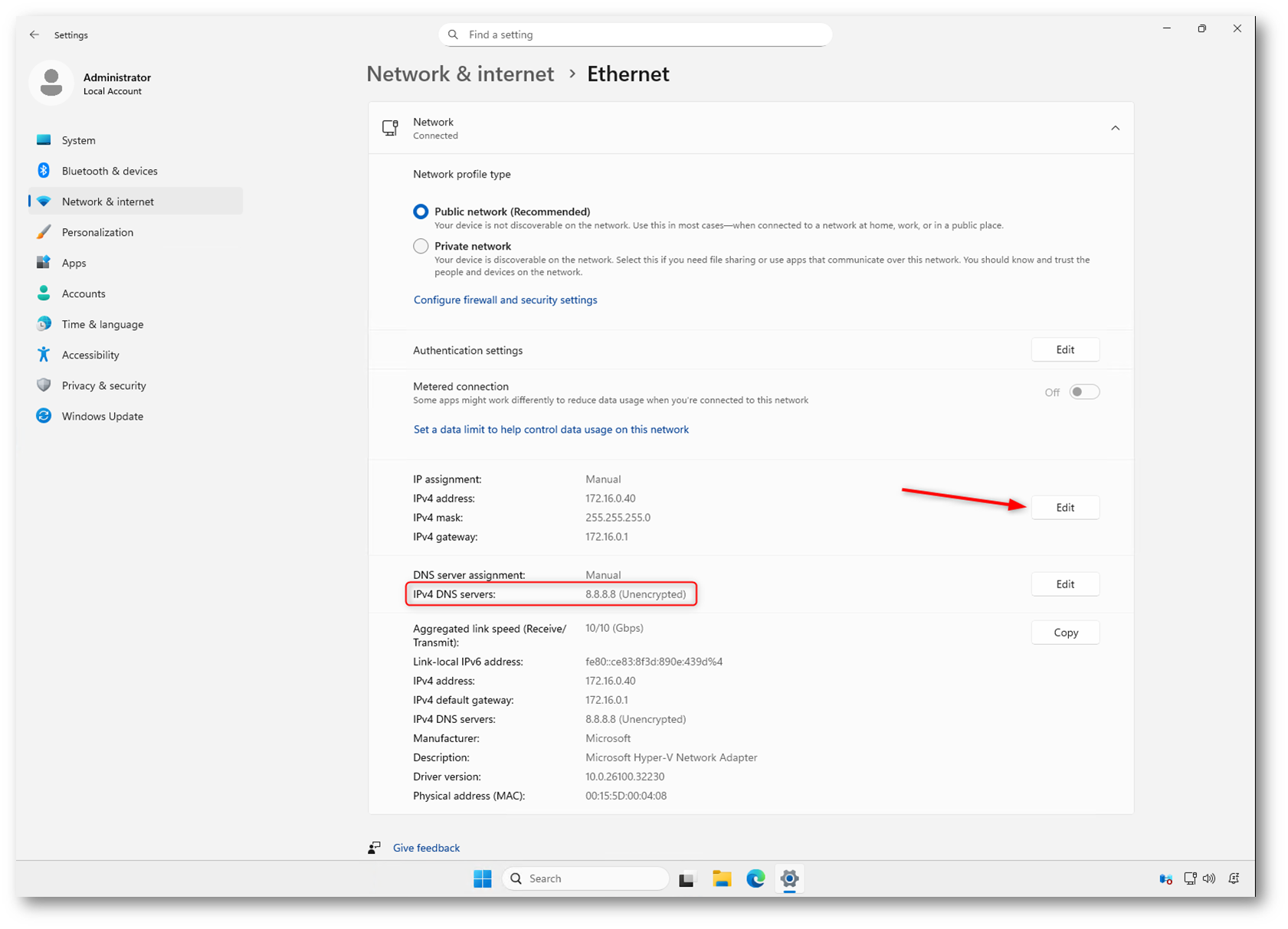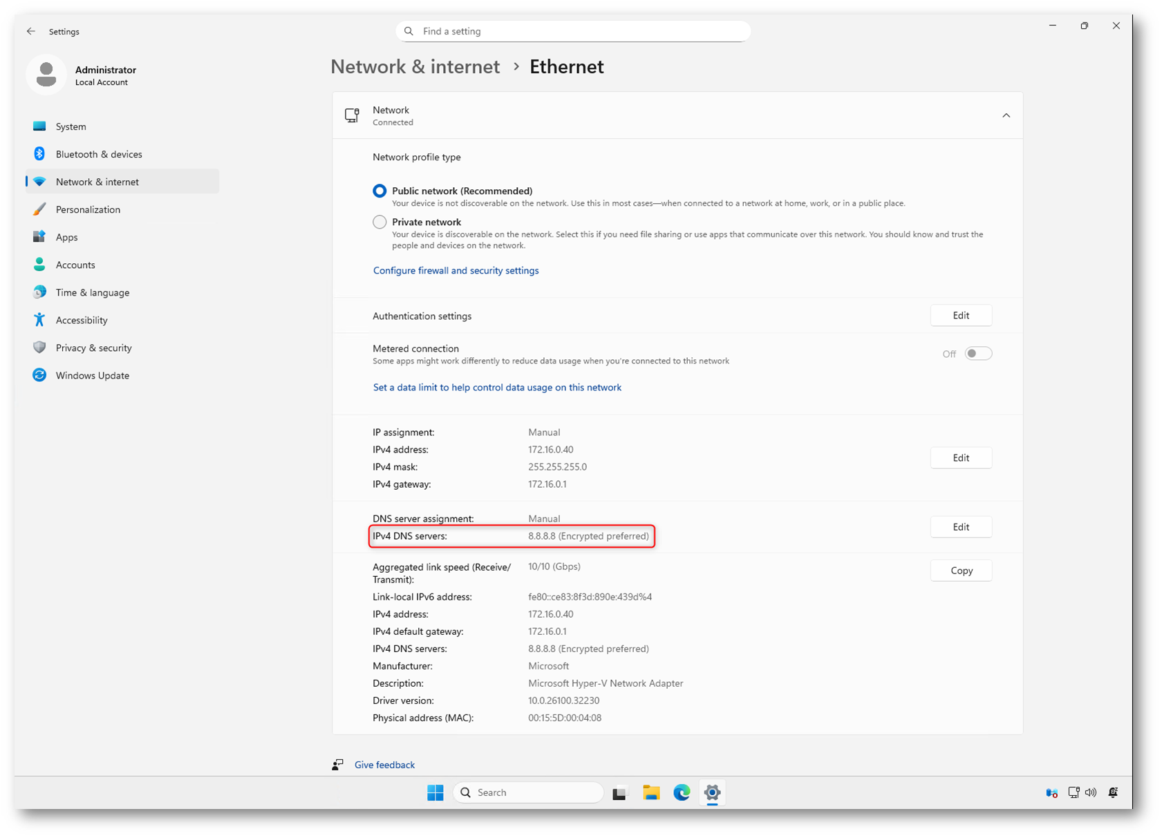 Figura 1: Configurazione DNS dell’interfaccia Ethernet con resolver 8.8.8.8 impostato in modalità non cifrata prima dell’abilitazione di DNS over HTTPS (DoH)