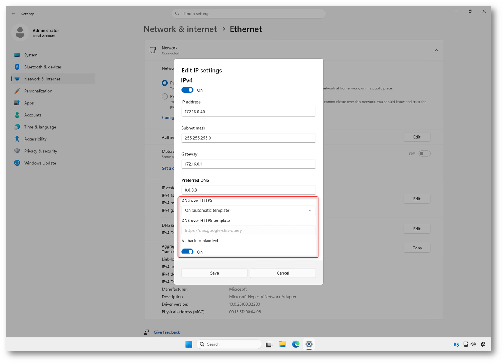 Configurate il resolver DNS e abilitate DNS over HTTPS direttamente dalle impostazioni della scheda di rete. Dopo aver inserito il server Preferred DNS, potete attivare la cifratura selezionando DNS over HTTPS e scegliendo l’opzione On (automatic template).