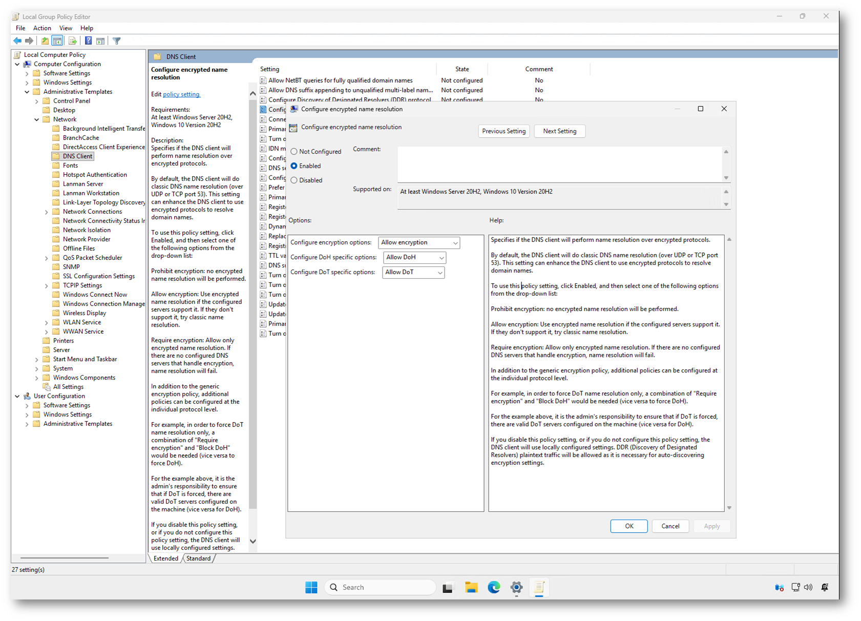 In ambienti Enterprise potete gestire DNS over HTTPS centralmente utilizzando le Group Policy. Dall’editor della policy accedete al percorso Computer Configuration > Administrative Templates > Network > DNS Client e aprite la policy Configure encrypted name resolution.