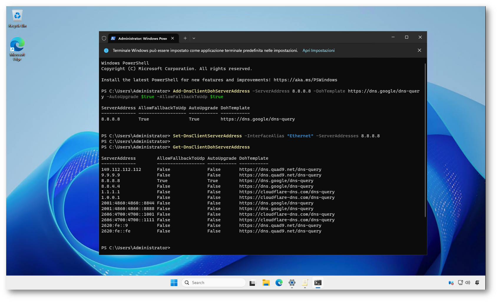Comandi PowerShell per configurare DNS over HTTPS